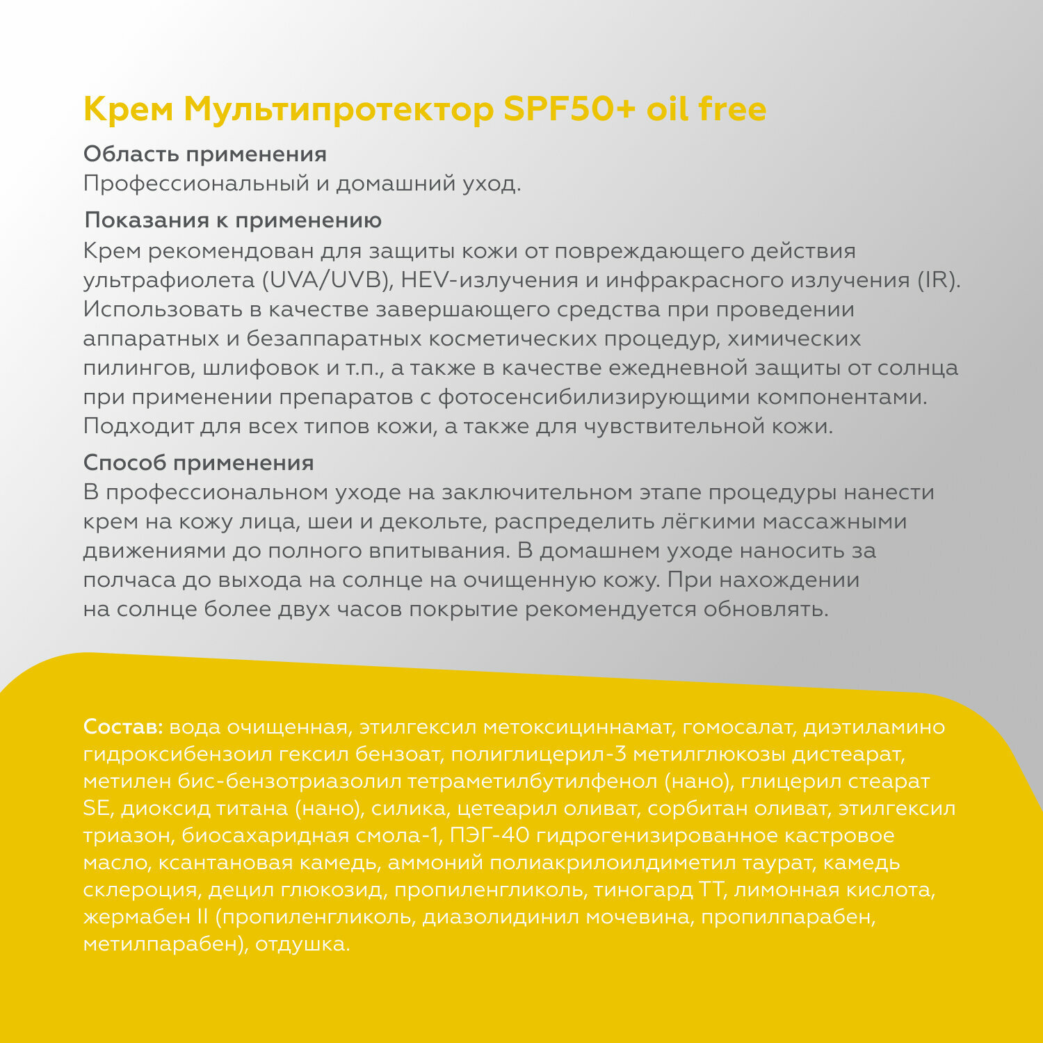 | Способ применения | Профессиональный уход: на заключительном этапе процедуры нанести 1-2 мл крема на кожу лица, шеи и декольте, распределить лёгкими массажными движениями до полного впитывания. Домашний уход: наносить за полчаса до выхода на солнце на очищенную кожу лица, шеи и декольте, а при необходимости и тела, в достаточном количестве для равномерного покрытия всей поверхности. Можно наносить на активные сыворотки, после их полного впитывания. При нахождении на солнце более двух часов покрытие рекомендуется обновлять. |