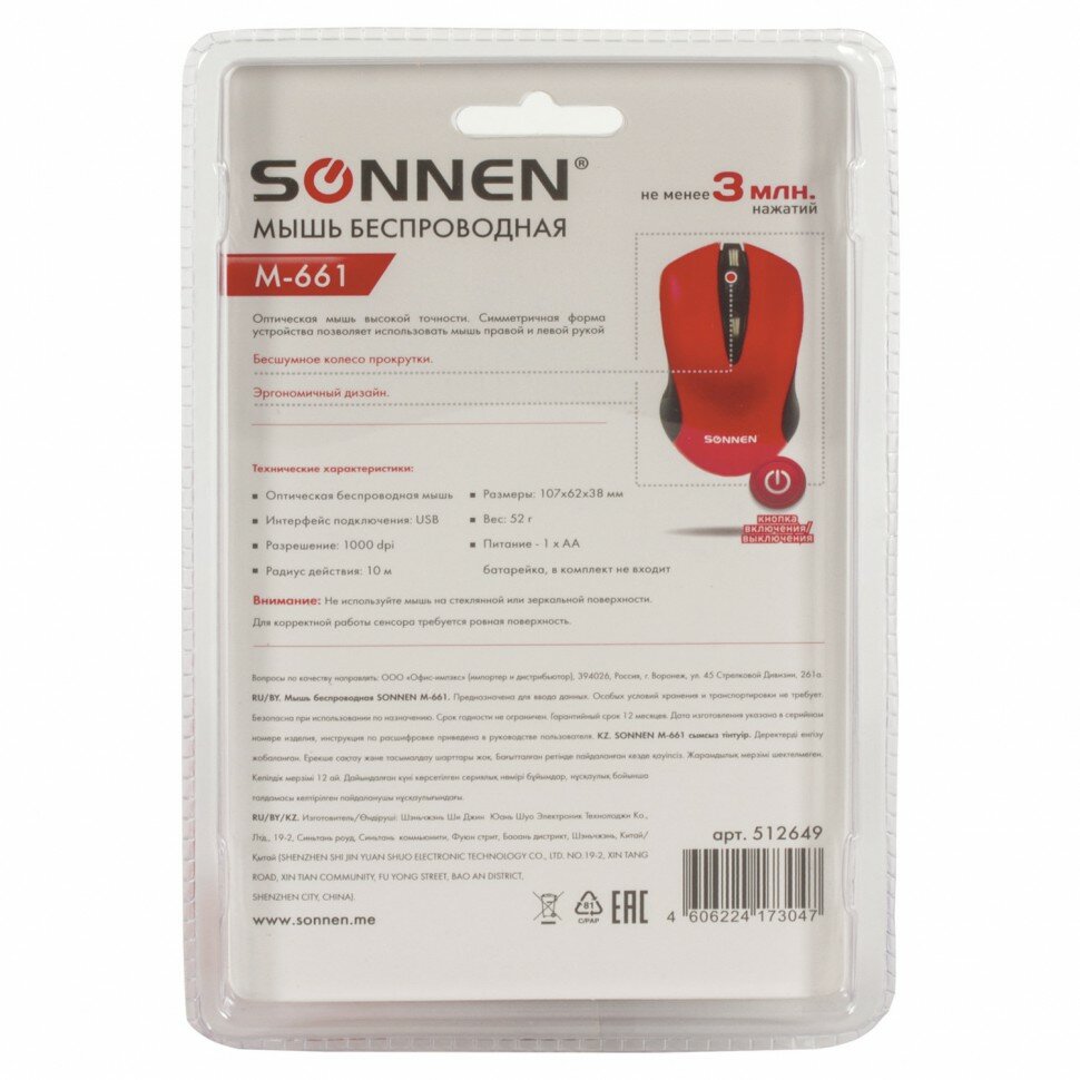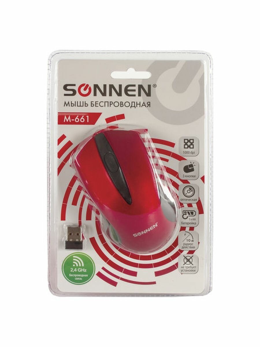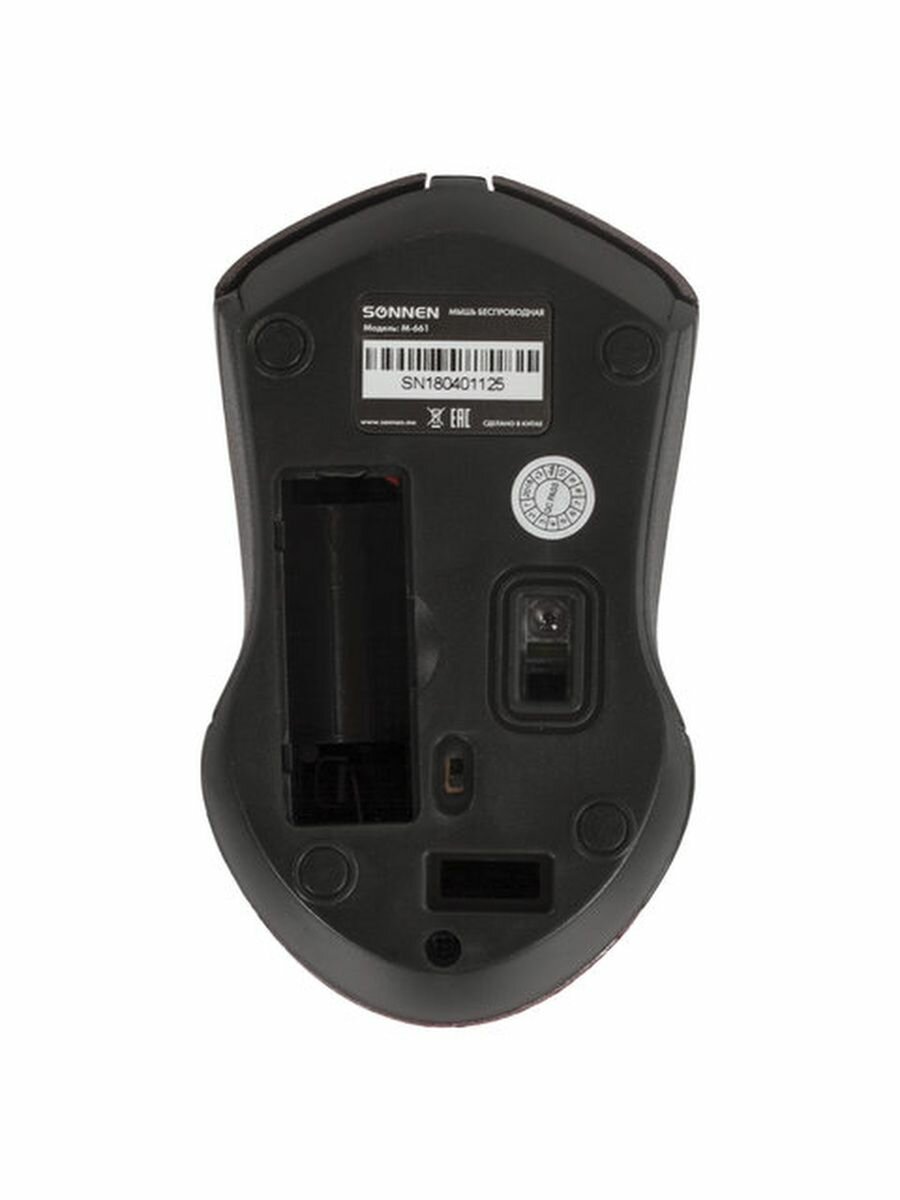 Беспроводная мышь SONNEN привлекает внимание стильным дизайном, а возможность смены разрешения оптического сенсора позволит подобрать оптимальный режим для работы.Беспроводная мышь SONNEN - это компактный манипулятор с симметричной формой корпуса, которым одинаково удобно пользоваться как правой, так и левой рукой. Модель идеально подходит для дома и офиса за счет оптимальной производительности и беспроводного подключения, в результате чего в процессе работы за компьютером вы не будете ограничены длиной кабеля питания. Для эффективной работы модель имеет 3 кнопки и оптический светодиодный сенсор с разрешением 1000 dpi. Дальность действия беспроводного модуля достигает 10 м. Питание осуществляется от обычной "пальчиковой" батарейки типа АА (входит в комплект). Размеры: 220х150х80 мм. Вес: 75 г.Приобретайте беспроводную мышь SONNEN в нашем интернет-магазине!Обзоры 1 Какую беспроводную или проводную мышь лучше выбрать для компьютера и ноутбукаЭто важнейший элемент управления, помогающий выполнить различные действия и упростить работу на ПК. Разновидностей очень много, поэтому перед покупкой необходимо ознакомиться с параметрами оборудования.Какие виды компьютерных мышек существуют?Как правильно подобрать мышь для ноутбука и компьютера?Читайте в этом материалеПодробнееРазъем - USB. Серия - M-661. Радиус действия - 10 м. Технология сенсора - оптическая. Количество кнопок - 3. Максимальное разрешение курсора - 1000 dpi. Тип питания - 1 батарея АА. Батарейки входят в комплект - да. Цвет корпуса - черный. Длина - 220 мм. Ширина - 150 мм. Высота - 80 мм. Вес - 75 г. Упаковка - блистер с европодвесом. Производитель - Китай Вес с упаковкой - 102 г Размер в упаковке - 5.4x20.8x13.3 см Сервисное обслуживание Гарантия 12 месяцев.