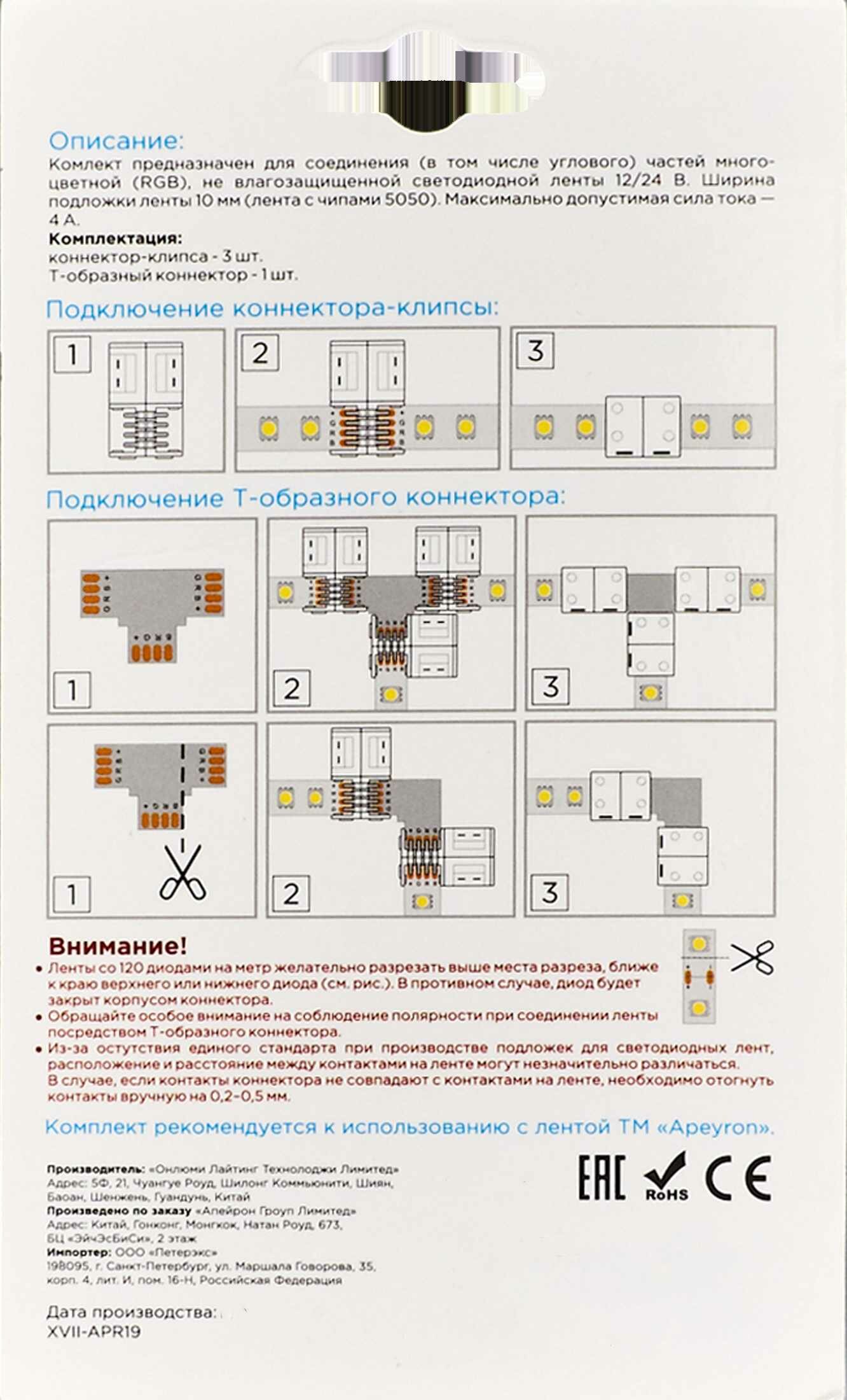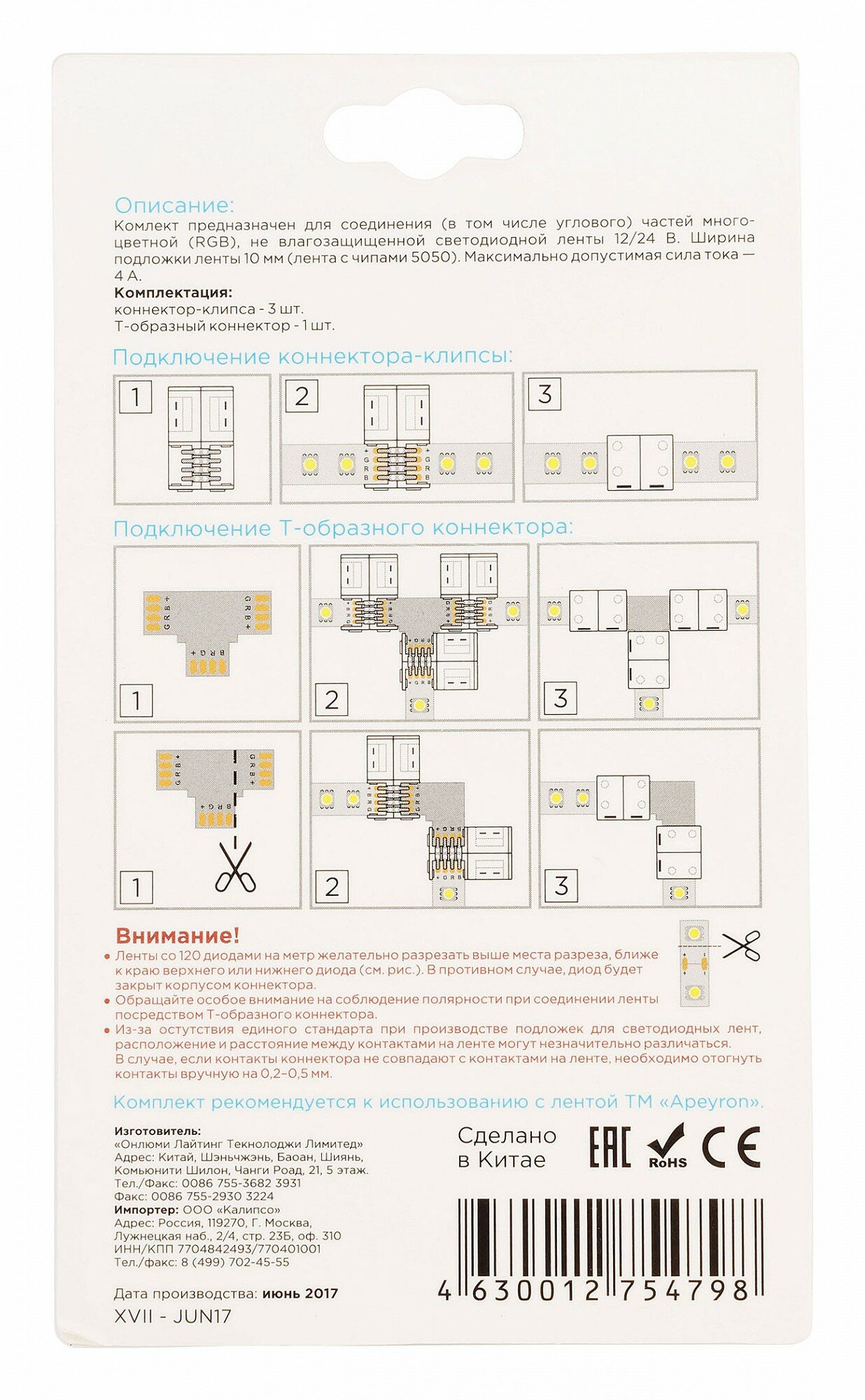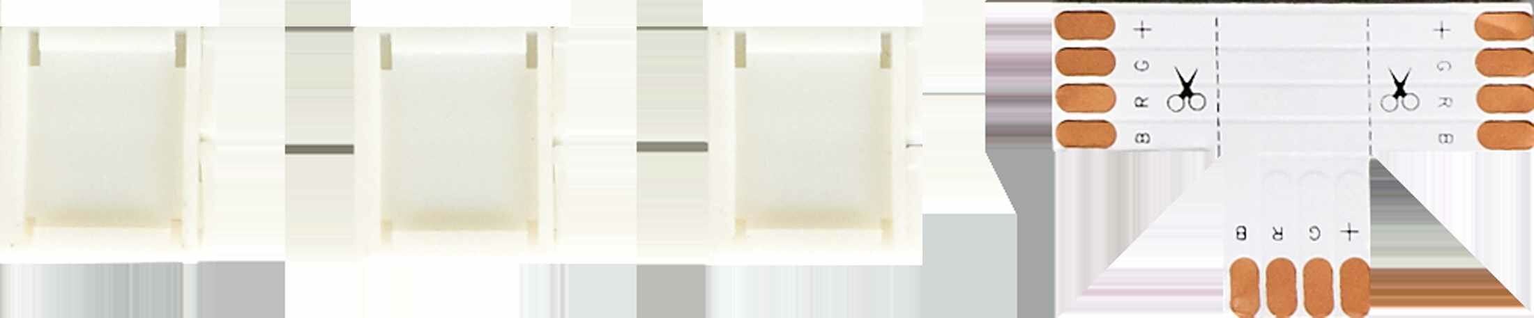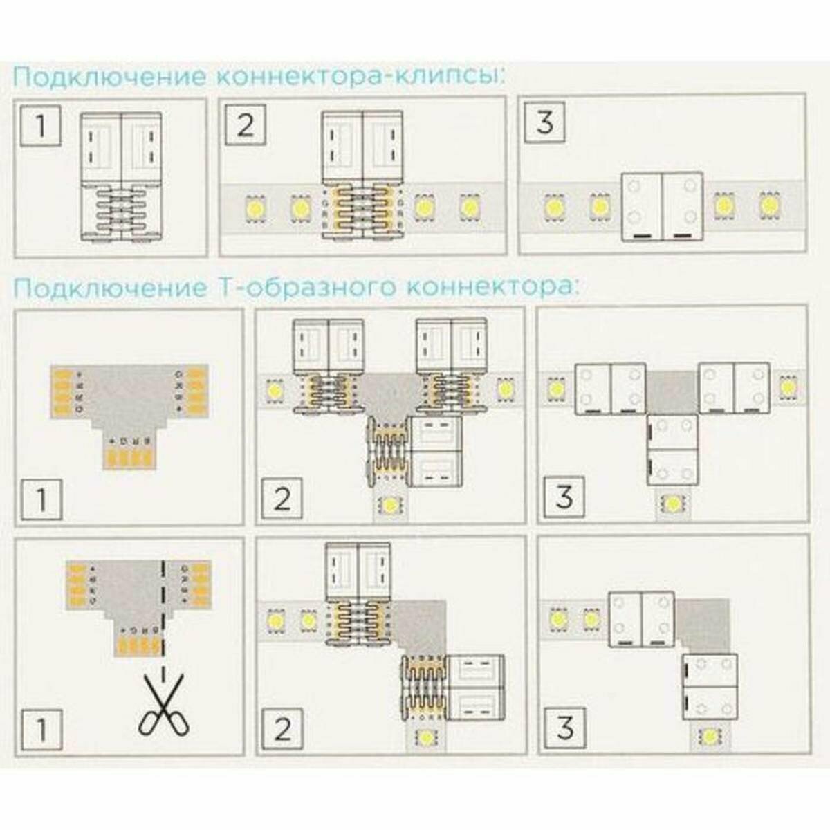 Комплект из Т-образного коннектора и 3 клипс с артикулом предназначен для многоцветной RGB-светодиодной ленты с диодами 5050. Степень защиты этого изделия соответствует стандарту IP20, что подразумевает использование только в сухих и проветриваемых помещениях. Подложка 10 мм.