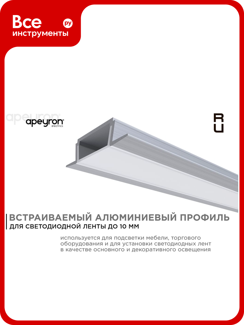 | Наименование модели | Профиль для светодиодной ленты APEYRON electrics прямой встраиваемый, анодированный алюминий, 1 м. 08-06 |