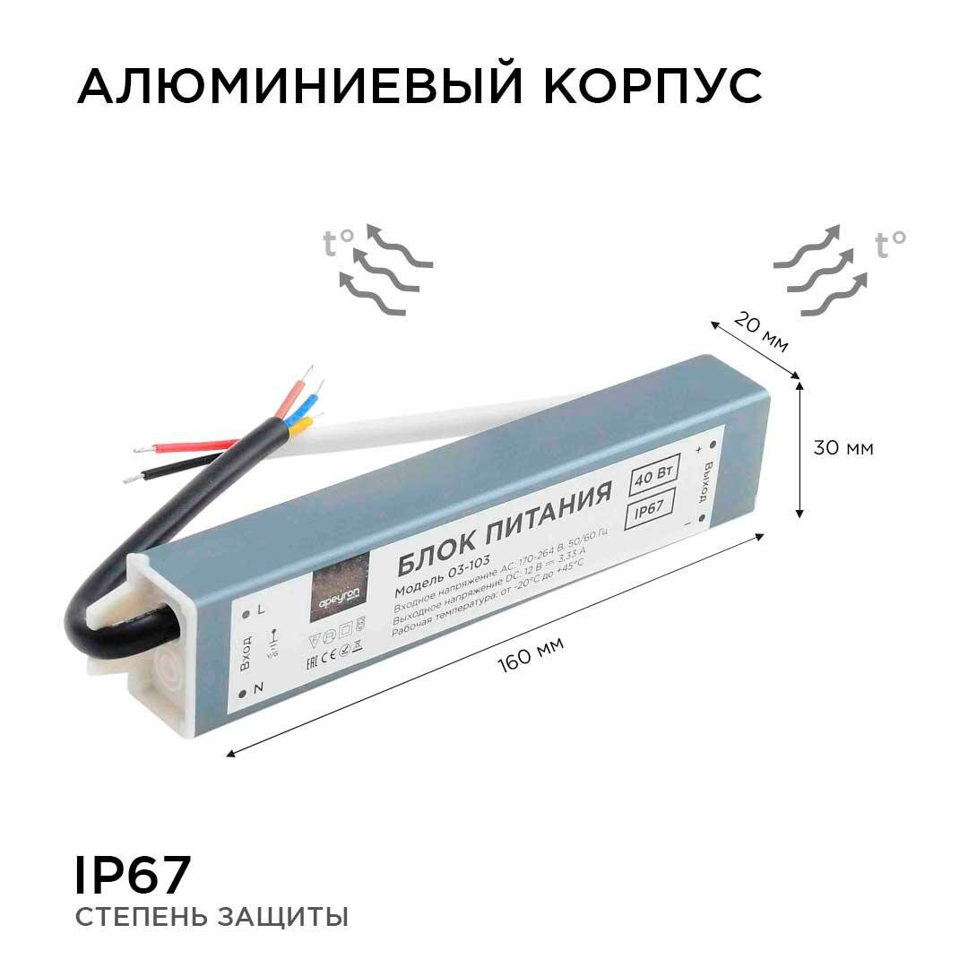 Блок питания импульсный Apeyron 12В 40Вт 3,33А IP67 преобразует переменный ток из сети с напряжением 220В в постоянный ток с напряжением 12В и обеспечивает оптимальный режим работы светодиодных осветительных приборов. Блок питания является идеальным источником питания для таких изделий, как светодиодная лента, светодиодные лампы, линейки и модули с рабочим напряжением 12В. Герметичный пластиковый корпус позволит найти место для монтажа в любом интерьере, спрятать в местах с ограниченным пространством. Он легок в подключении благодаря проводам с цветовой маркировкой и обозначениям на корпусе. Для безопасной работы блок дополнительно оснащен схемами защиты светодиодной ленты от аварийных ситуаций скачков напряжения, возможных коротких замыканий. Входной фильтр обеспечивает бесперебойную работу при скачках напряжения, выходной фильтр сглаживает пульсацию и защищает ваши глаза. Степень защиты от пыли и влаги позволяет использовать данну модель блока питания в тех местах, где есть высокий уровень воздействия влаги и вероятность попадания воды. Источники питания полностью совместимы со светодиодной лентой торговой марки Apeyron Electrics и обеспечивают оптимальный режим работы и долгий срок службы светодиодов.