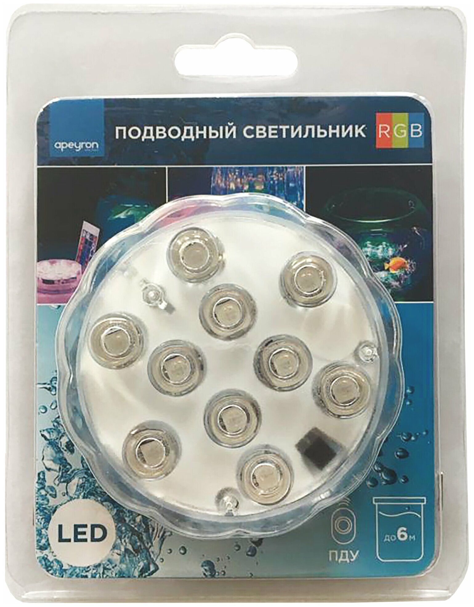 Декоративный светодиодный подводный RGB-светильник, который можно погружать на глубину до 6 метров. Светодиодный светильник можно использовать как лампа для аквариума, или подсветка бассейна, джакузи, ванны, фонтанов, неглубоких водоемов. Работает от 3 батареек ААА (не входят в комплект). Освещение для аквариума с помощью подсветки светильника Apeyron придает более завораживающий и эстетичный вид. Несколько режимов свечения лампы в аквариум позволяют подобрать освещение под ваше настроение.Корпус LED-светильника изготовлен из прозрачного светорассеивающего поликарбоната и соответствует стандарту защиты от пыли и влаги IP68. В место, где крышка соединяется с корпусом, установлено две прокладки, которые исключат попадание воды внутрь. Над каждым светодиодом стоят линзы, увеличивающие угол рассеивания до 180°, благодаря чему даже один светильник сможет создать хорошее свечение в резервуаре с водой, которая дополнительно усилит этот эффект. В светильнике для аквариума используются светодиоды 5050 с RGB-матрицей, которая позволит выбрать цвет свечения светильника под любое настроение. А встроенный RGB-контроллер позволит включать различные динамические режимы, регулировать скорость смены цветов и яркость свечения. Светильником можно управлять без непосредственного контакта с помощью дистанционного пульта передающего сигнал по ИК каналу.Подводный светильник с ИК-пультом предназначен для подводного декоративного освещения: аквариумов, небольших бассейнов, мелких, неглубоких водоемов, фонтанов, цветочных ваз. Светодиодный светильник Apeyron ищут как: светильник в аквариум, подводный светильник, подводное освещение, свет в ванной, свет под водой, освещение для бассейна, свет для бассейна, аквариум с подсветкой, декор для аквариума, лампы для аквариума.Подводный светильник с ИК-пультом предназначен для подводного декоративного освещения:- аквариумов,- небольших бассейнов,- мелких, неглубоких водоемов,- фонтанов,- цветочных ваз.