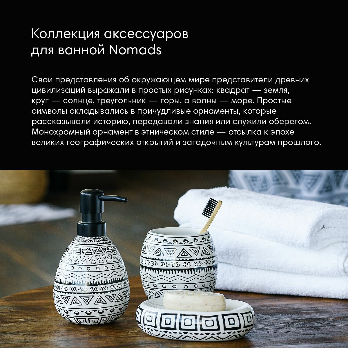 Мягкий коврик для ванной комнаты чёрно-белого цвета размером 40 х 60 см. Благодаря специальному покрытию коврик не скользит, что делает его эксплуатации комфортной и безопасной. Материал изделия отлично впитывает влагу и при этом быстро сохнет. Геометрический рисунок вдохновлён этническими мотивами кочевых народов. Аксессуар отлично смотрится в сочетании с другими элементами коллекции Nomands.
