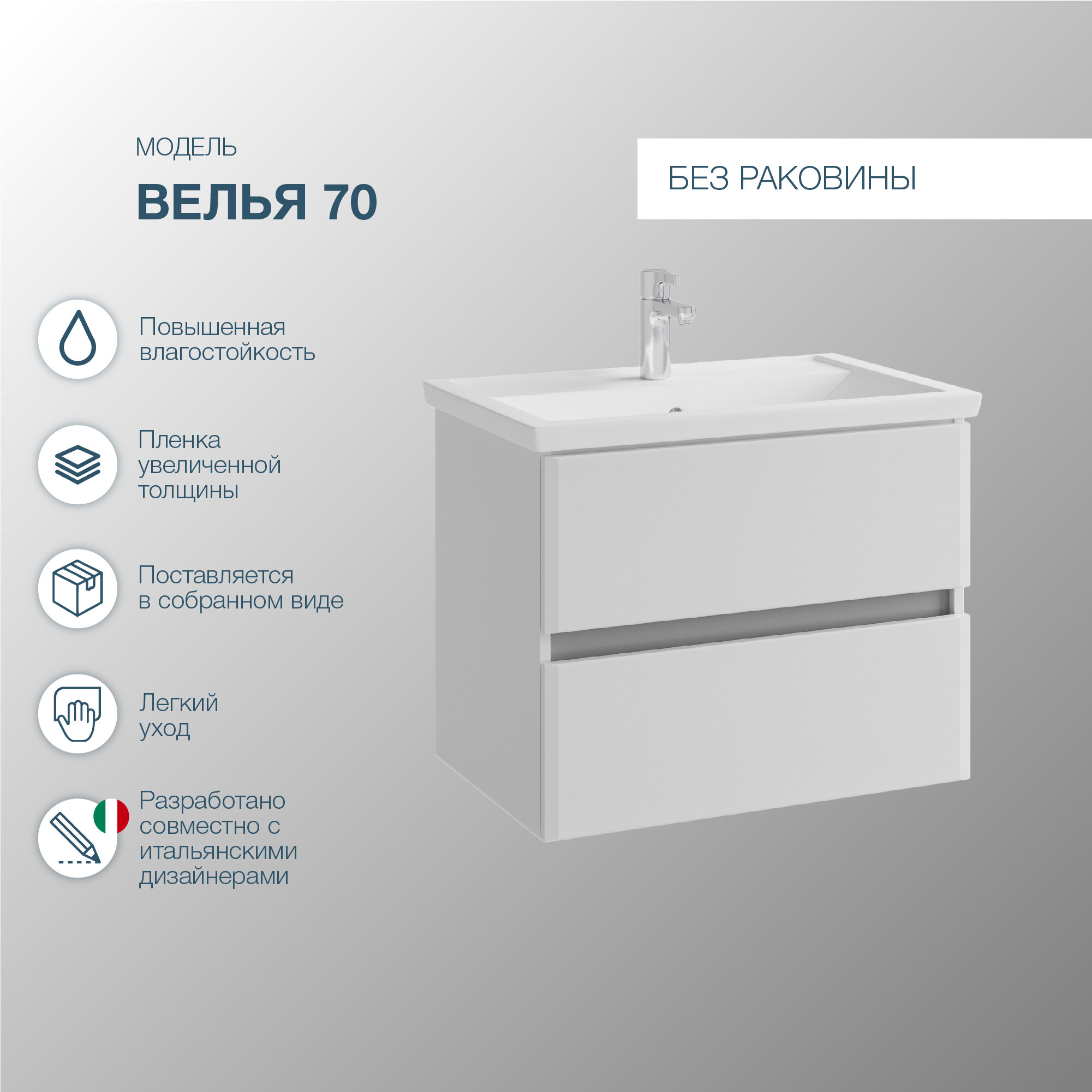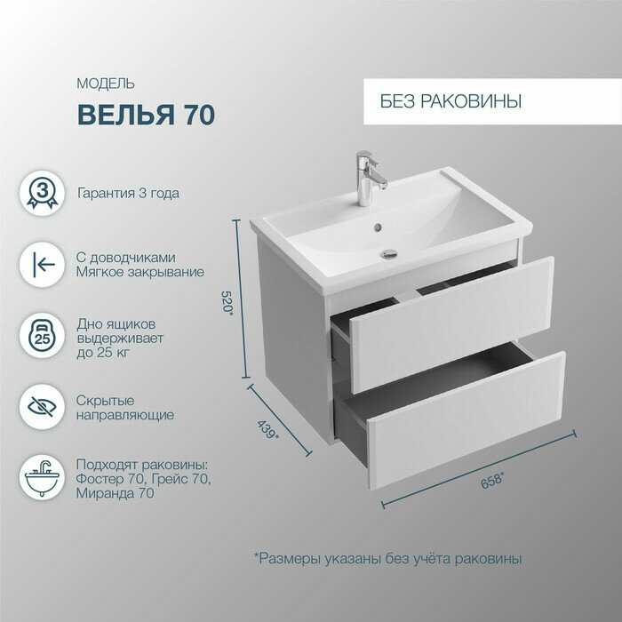 Тумба для комплекта Sanstar Велья 70 несравненное решение для создания комфортной атмосферы в любой ванной комнате. Подвесной способ установки дает возможность не только визуально увеличить пространство, но и обеспечивает быстрый и удобный доступ для уборки.