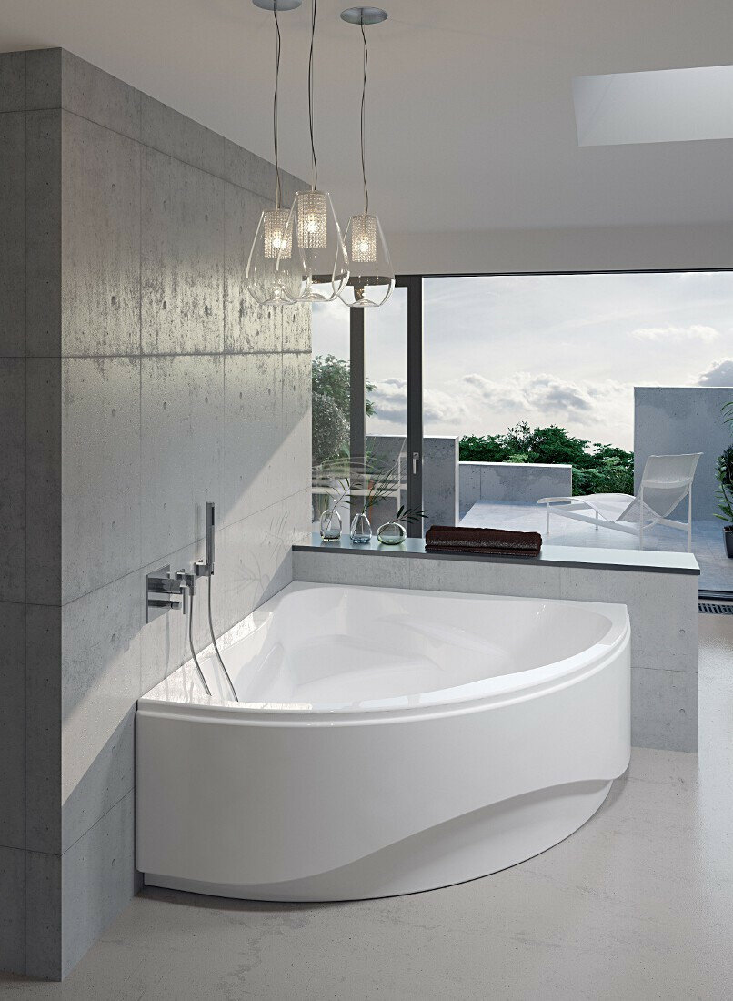 Форма ванны Riho четверть круга размером 140 см на 140 см идеально подойдет к любому интерьерному решению, в различных вариантах размещения внутри ванной комнаты. Пристенная установка ванны Neo из акрила это наиболее традиционный вид установки, а при использовании декоративного экрана пространство под ванной можно использовать как место хранения моющих средств. Ванна Riho Neo выполнена со строгим соблюдением всех ключевых элементов современного стиля.