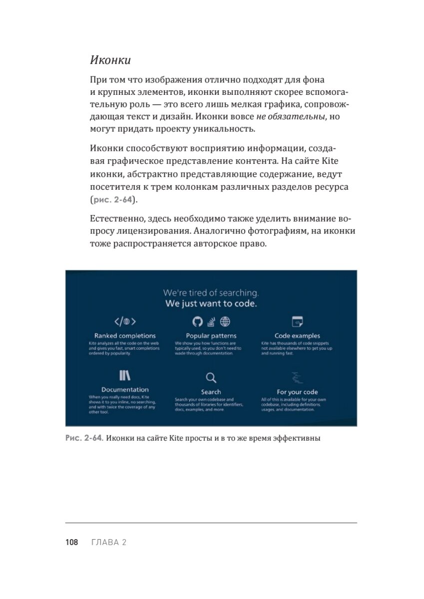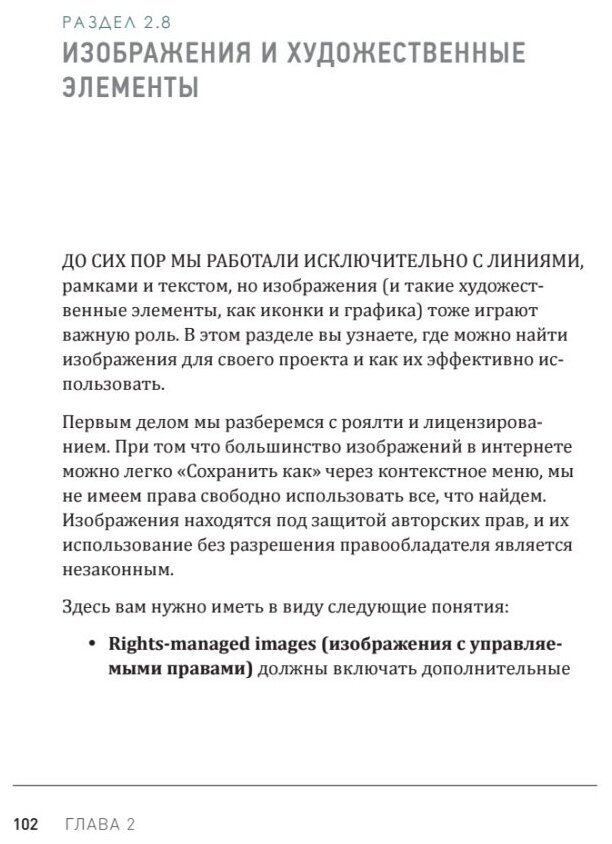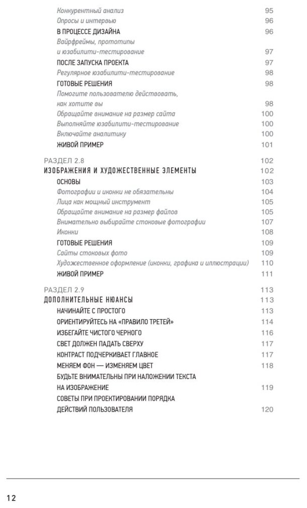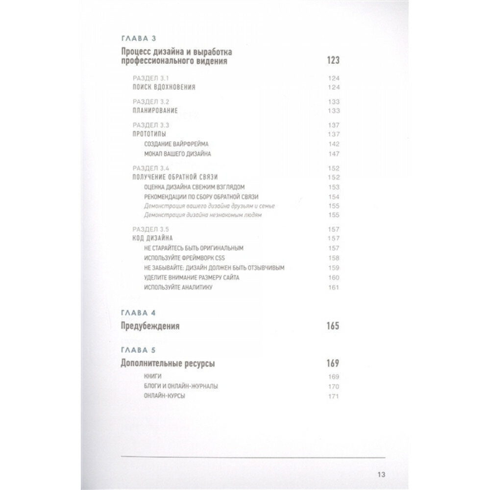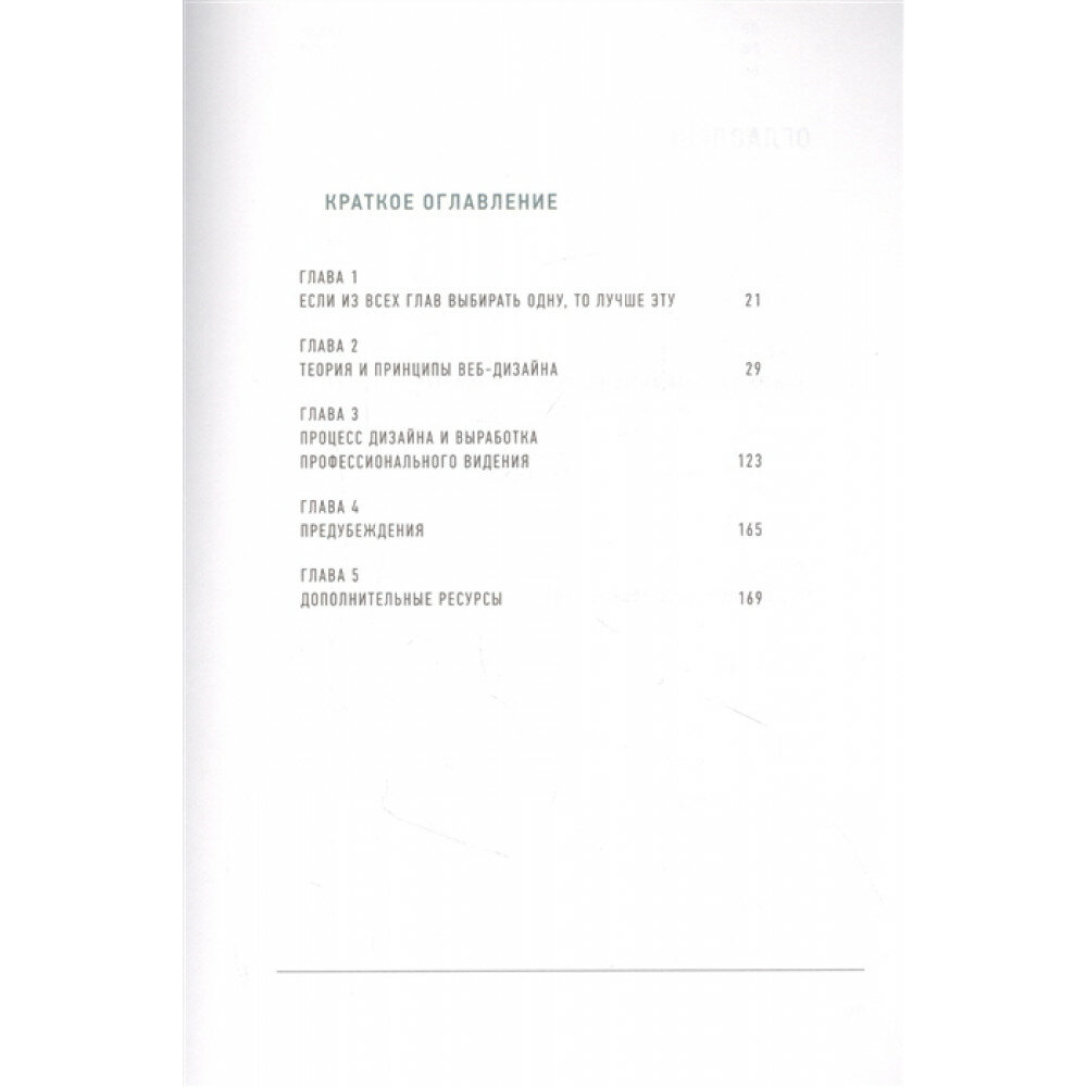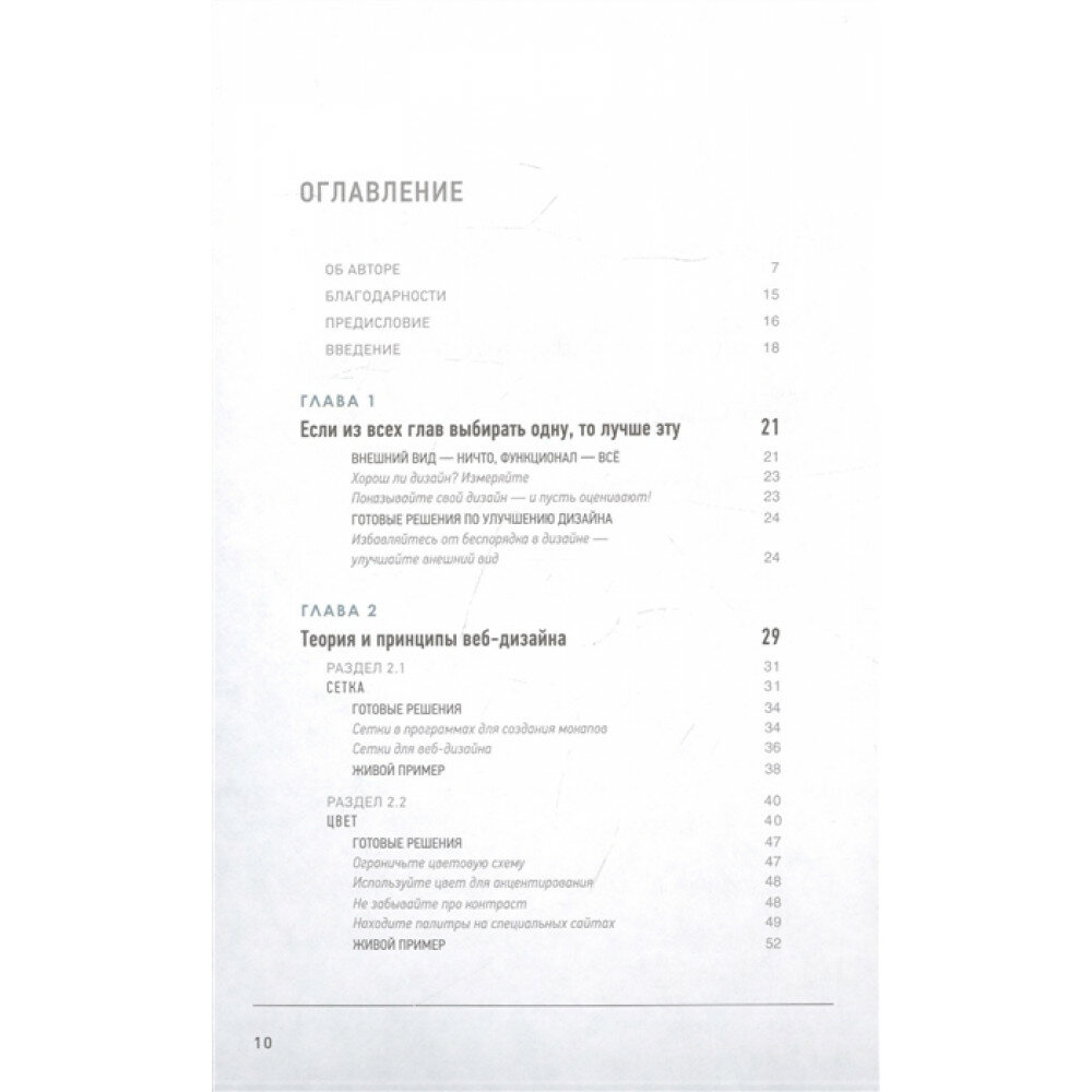 Название книги "Веб дизайн для недизайнеров" говорит само для себя. Дело в том, что многие современные профессии требуют хоть малейшие знания вебдизайна, это такие работы как например маркетолог, продажник или менеджер, где вы так или иначе занимаетесь дизайном в какой-то степени, однако у вас не стоит цели стать вебдизайнером и не так много времени на изучение целой отдельной профессии. Поэтому автор составила "сжатое изложение" по всему тому, что может вам пригодиться в этой области, скажем так шпаргалка, "горячие клавиши" и лайфхаки от автора. Она, - автор, даже выделила самую, скажем так, главную главу для особо занятых и не желающих вбивать себе в голову лишнее. Однако зачем вбивать, все таки вам не обязательно сдавать экзамен, такая книга может быть всегда под рукой на случай скорой помощи. Настолько скорой, что автор собрала в ней помимо теории реальные примеры и сразу же готовые решения. На столько же, на сколько важен внешний вид в этом деле, настолько и представлено все в иллюстрациях-примерах, что так же облегчает процесс изучения и понимания, а вся объемная, насколько бы мы не облегчали, информация удобно разбита для понимания и работы по оглавлению. Это действительно отличная книга по вебдизайну для не дизайнеров.