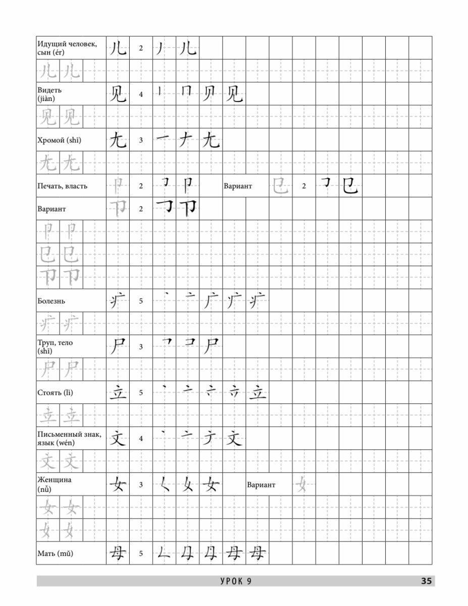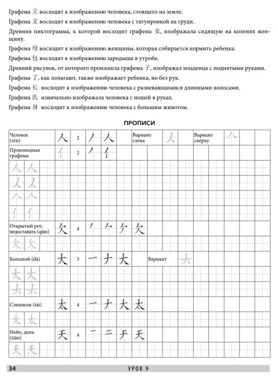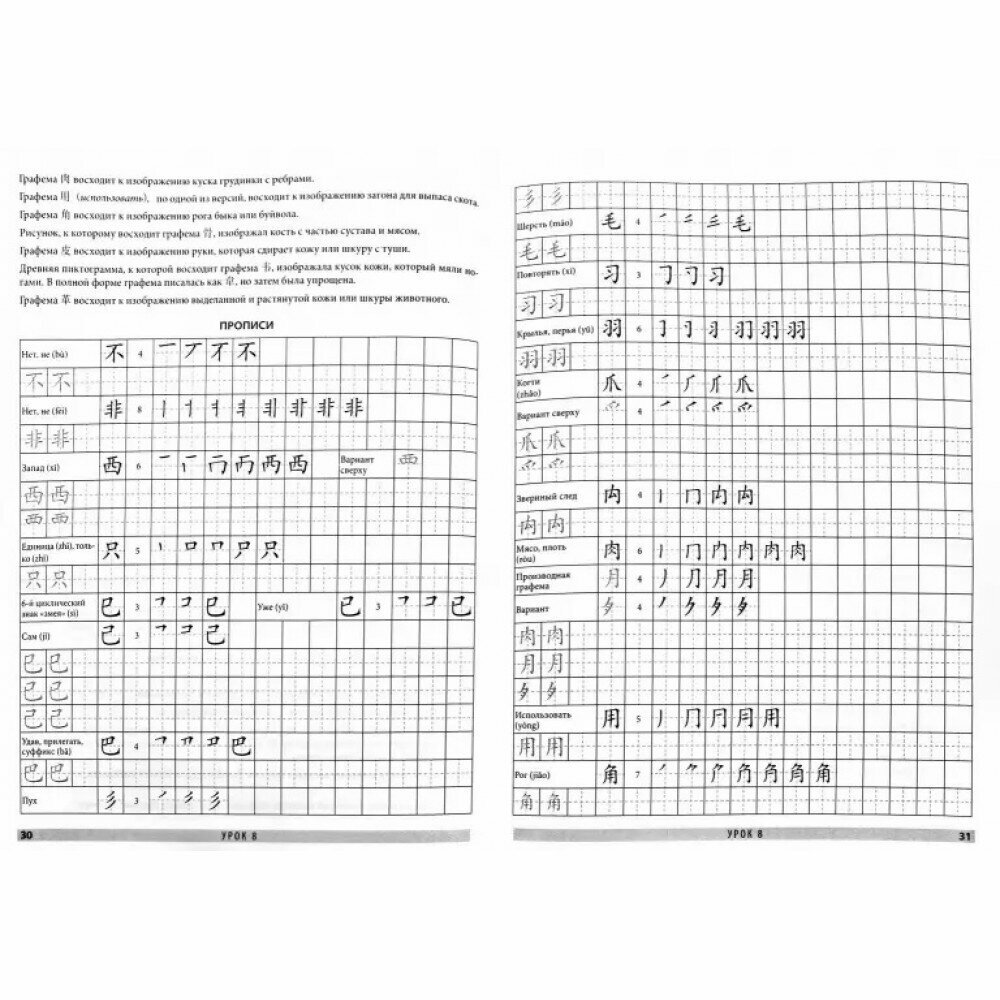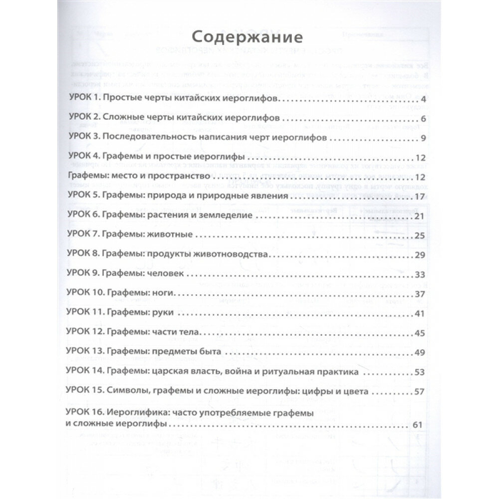 В этих обучающих прописях даны основы иероглифики китайского языка. В книге 16 уроков, каждый из которых состоит из теоретической части и прописей для отработки пройденной темы. Материал изложен от простого к сложному: сначала мы учимся писать иероглифические черты, затем осваиваем правила написания иероглифов, после этого переходим к изучению базовых иероглифических элементов — графем и заканчиваем сложными иероглифами.