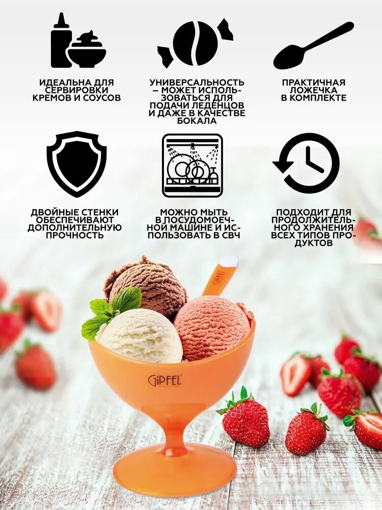 Креманка с ложкой GIPFEL LUMINO 9481. Креманка снаружи оранжевого цвета, внутренняя поверхность белая. Размер креманки 10см х 10см. У креманки двойные стенки. Креманка и ложка сделаны из пластика.