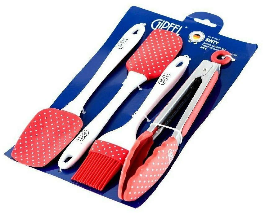 Набор кухонных аксессуаров GIPFEL SINTY 6327. В наборе 4 предмета: щипцы 23см, кисточка 22см, лопатка узкая 25см, лопатка широкая 25,5см. Рабочая часть предметов выполнена из силикона, ручки пластиковые. Все аксессуары яркого красного цвета в белый горох. Ручки имеют кольцо для подвешивания. Материал: силикон, нержавеющая сталь, пластик.
