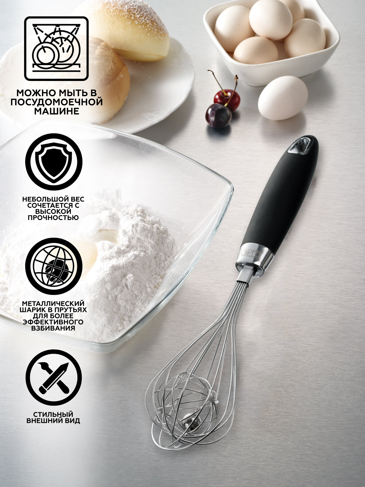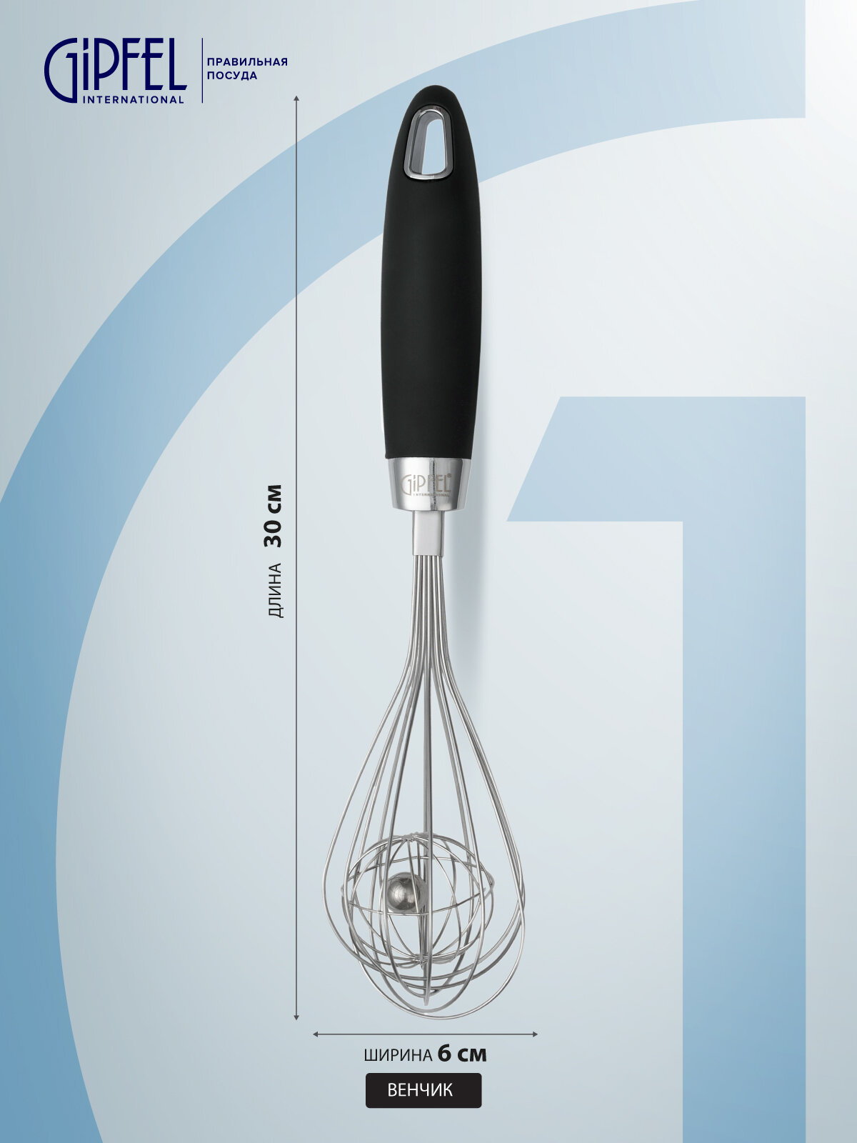 Венчик GIPFEL MONTEGO 9316 длиной 30см. Рабочая поверхность размером 6х16см. Материал: нержавеющая сталь, пластик, термопластичная резина, цинковый сплав.