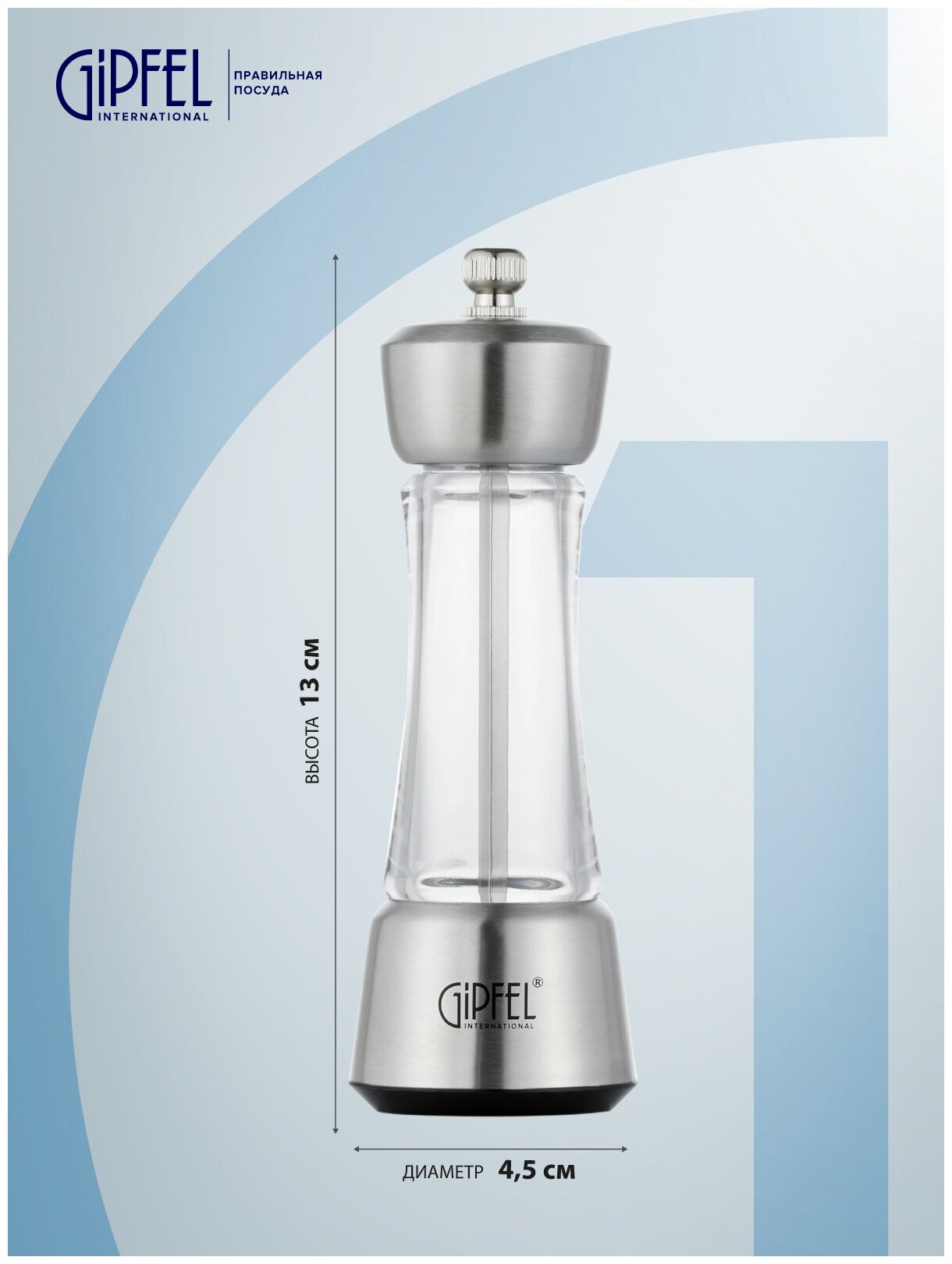 Мельница механическая GIPFEL QUEEN 50662. Подходит для всех видов приправ, соли и перца. Высота 13 см. Цвет: серебристый. Материал: нержавеющая сталь, пластик, керамика.