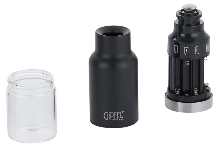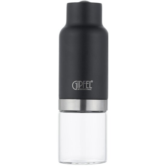 Мельница электрическая гравитационная GIPFEL KING 50666. Подходит для всех видов приправ, соли и перца. У мельницы стеклянный корпус. Высота 18,5 см. Цвет черный. Материал: пластик, стекло, керамика. Жернова керамические. Размер помола регулируется колёсиком. Работает от 6 батареек (в комплект не входят).