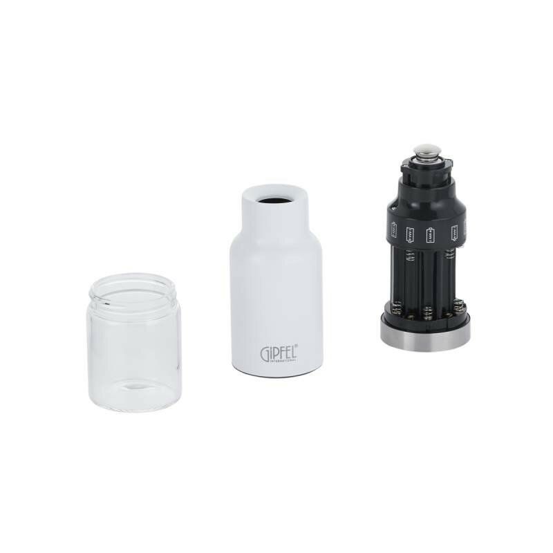 Мельница электрическая гравитационная GIPFEL KING 50665. Подходит для всех видов приправ, соли и перца. У мельницы стеклянный корпус. Высота 18,5 см. Цвет белый. Материал: пластик, стекло, керамика. Жернова керамические. Размер помола регулируется колёсиком. Работает от 6 батареек (в комплект не входят).