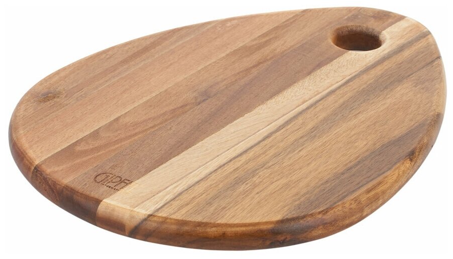 Доска разделочная GIPFEL MUXIA 50947. Размер доски 32х25х1,8см. Доска сделана из акации светло-коричневого цвета. Деревянная доска придется по душе хозяйкам, ценящим экологичность и натуральность кухонных аксессуаров. Доска вырезана в виде капли и имеет отверстие для подвешивания. Доску также можно использовать, как сервировочную: подавать на ней нарезанный сыр, канапе или другие закуски.