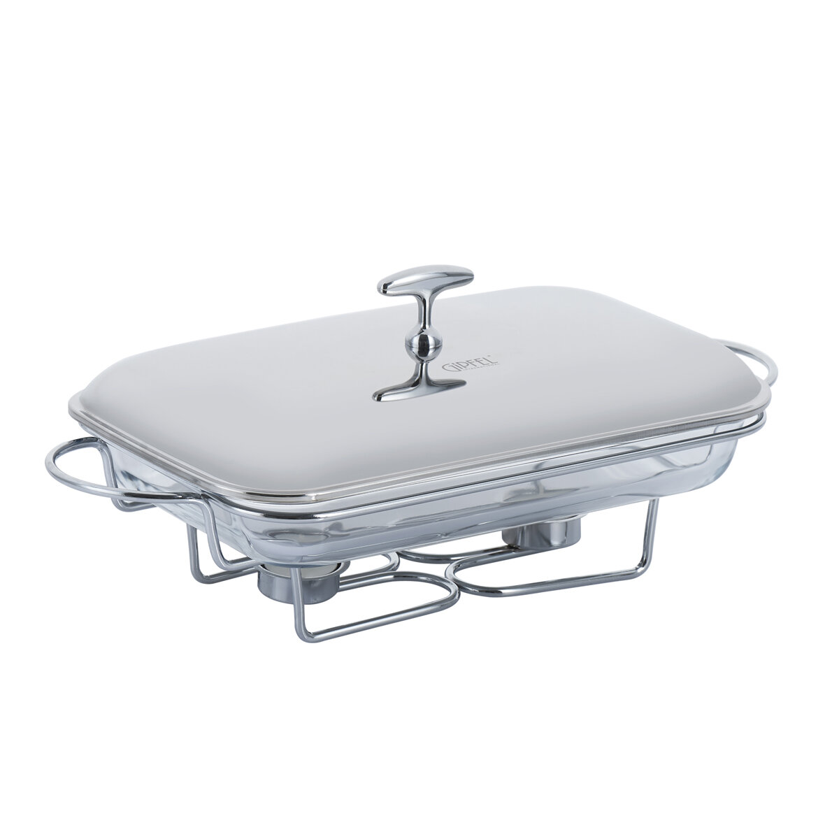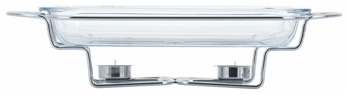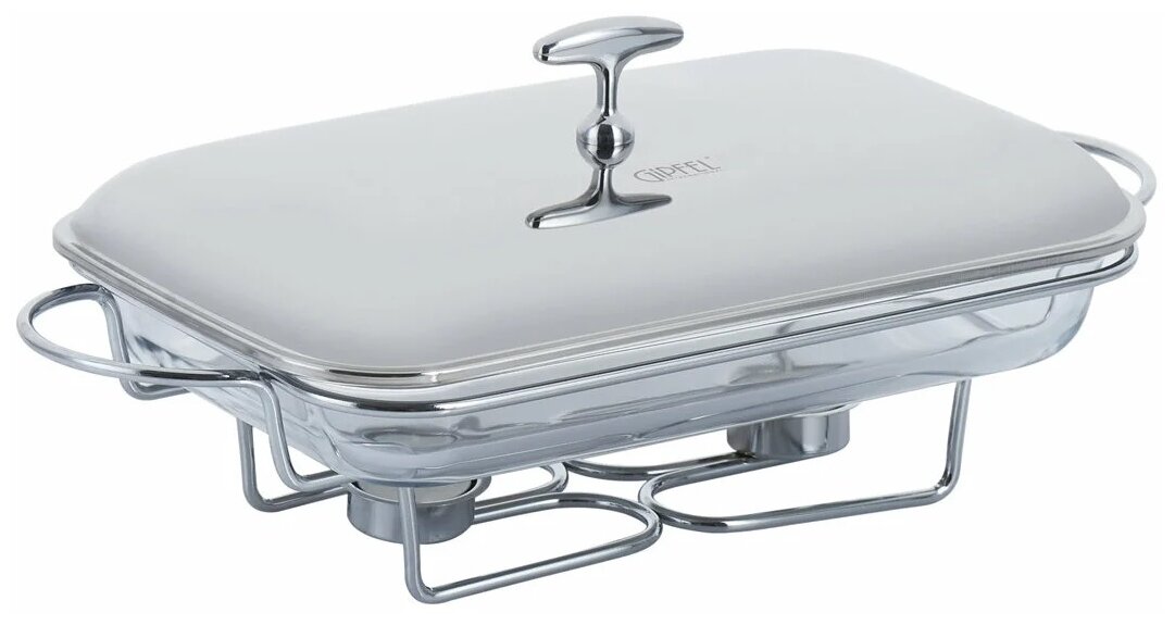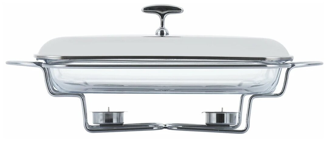 Мармит прямоугольный GIPFEL MACKENZIE 5031. Размер чаши 34,5x21x5см, объем 1,9 л. Высота каркаса - 12 см, длина с ручками - 44,5 см. Мармит со стеклянным контейнером и двумя держателями для свечей. Материал: термостойкое стекло, цинковый сплав, нержавеющая сталь.Прямоугольный стеклянный контейнер объемом 2,2 литра оснащен металлической крышкой с зеркальной полировкой. Хромированный каркас с ручками имеет подставку под свечи. Греющие свечи поставляются в комплекте. Стеклянный контейнер выполнен из жаропрочного стекла, его можно использовать в микроволновой печи и мыть в посудомоечной машине. Мармит упакован в фирменную коробку Gipfel.