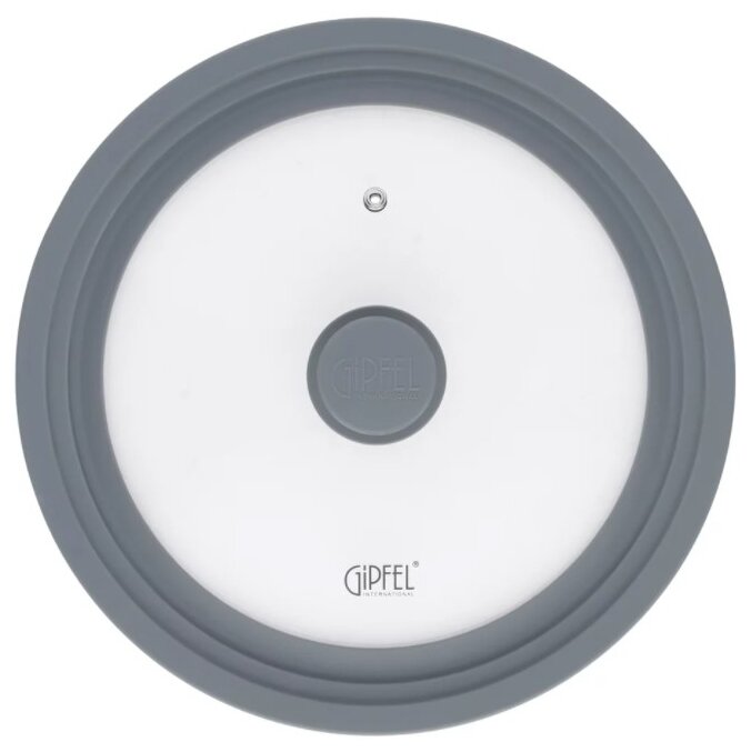 Крышка стеклянная Gipfel Gium 1029. Крышка универсальная, рассчитана на три диаметра сковород: 24,26,28см. У крышки силиконовый обод серого цвета, что позволяет использовать ее с посудой, имеющей антипригарное покрытие, не боясь его повредить. Сделана из закаленного стекла и имеет не нагревающуюся силиконовую ручку. Крепление ручки из нержавеющей стали 18/8 не заржавеет и прослужит долго. В крышке имеется отверстие для выхода пара из нержавеющей стали.