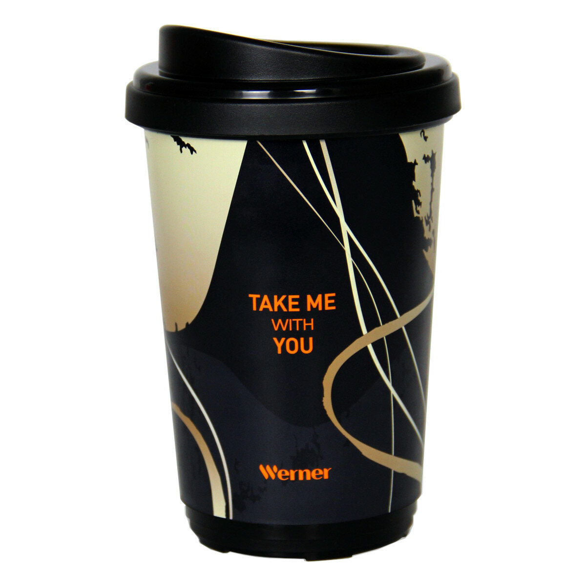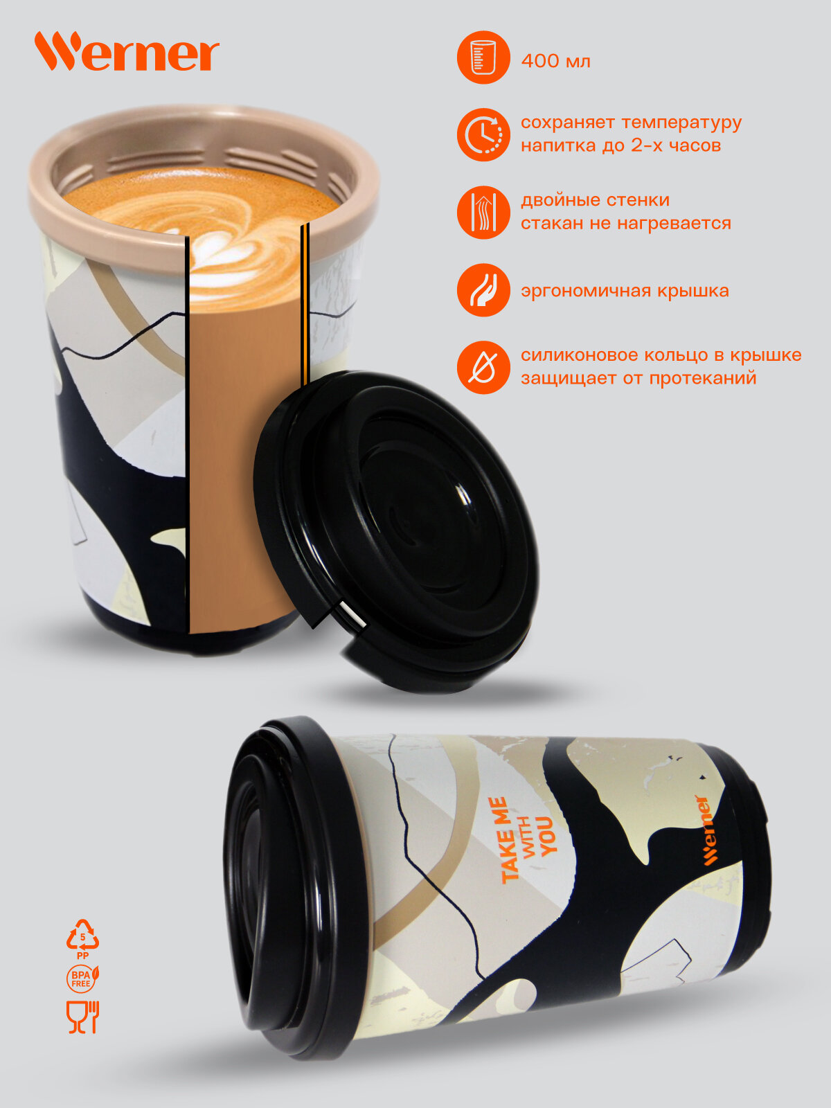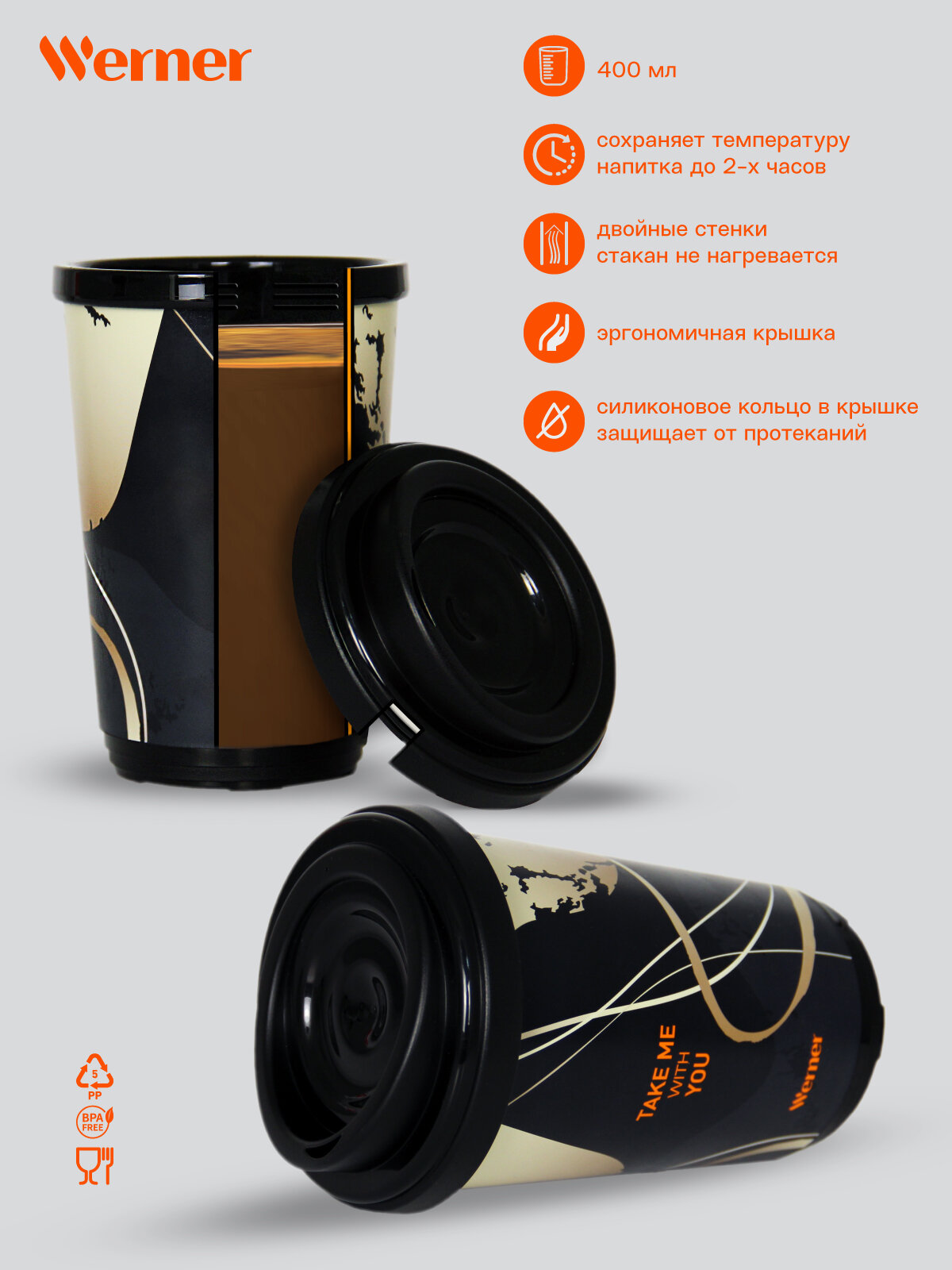 Термостакан с двойными стенками и крышкой WERNER 51484. Объем стакана 400 мл. Двуслойный термостакан - идеальное решение для энергичной жизни в большом городе. Воздушная прослойка между стенками сохраняет тепло напитка до двух часов: стакан удобно взять с собой на прогулку, в поездку на автомобиле или на работу. Внешняя стенка почти не нагревается, а поверхность не скользит, поэтому стакан удобно держать в руке. Крышка плотно закручивается и имеет эргономичный носик для питья. Термостакан изготавливается из безопасного полипропилена, и не содержит бисфенол А, фталаты, меламин и другие вредные вещества (в отличие от одноразовых стаканов). Такой материал не боится ни зимнего холода, ни обжигающе горячей воды: диапазон допустимых температур эксплуатации от -24°С до +95°С. Рисунок, вплавленный в корпус, не сотрется и не потускнеет. Стильный современный дизайн создаст прекрасное настроение на целый день.