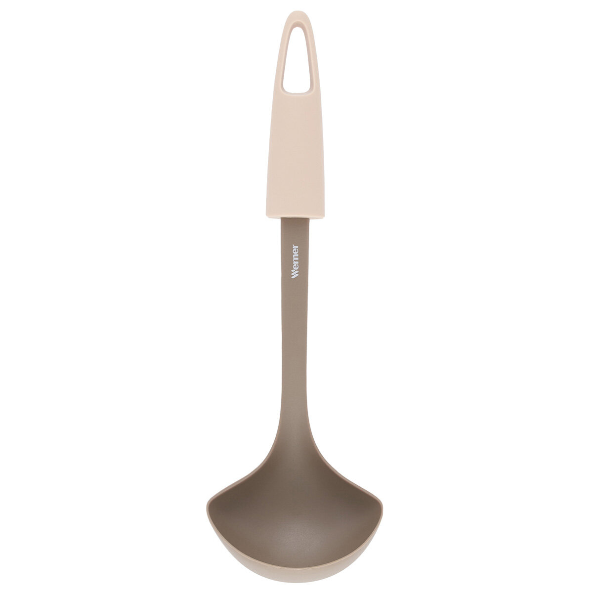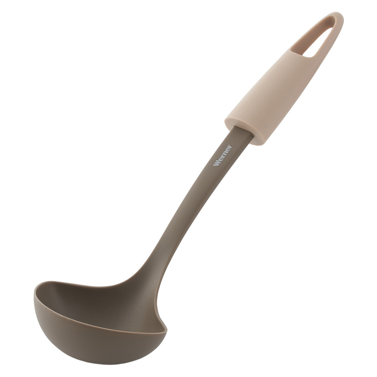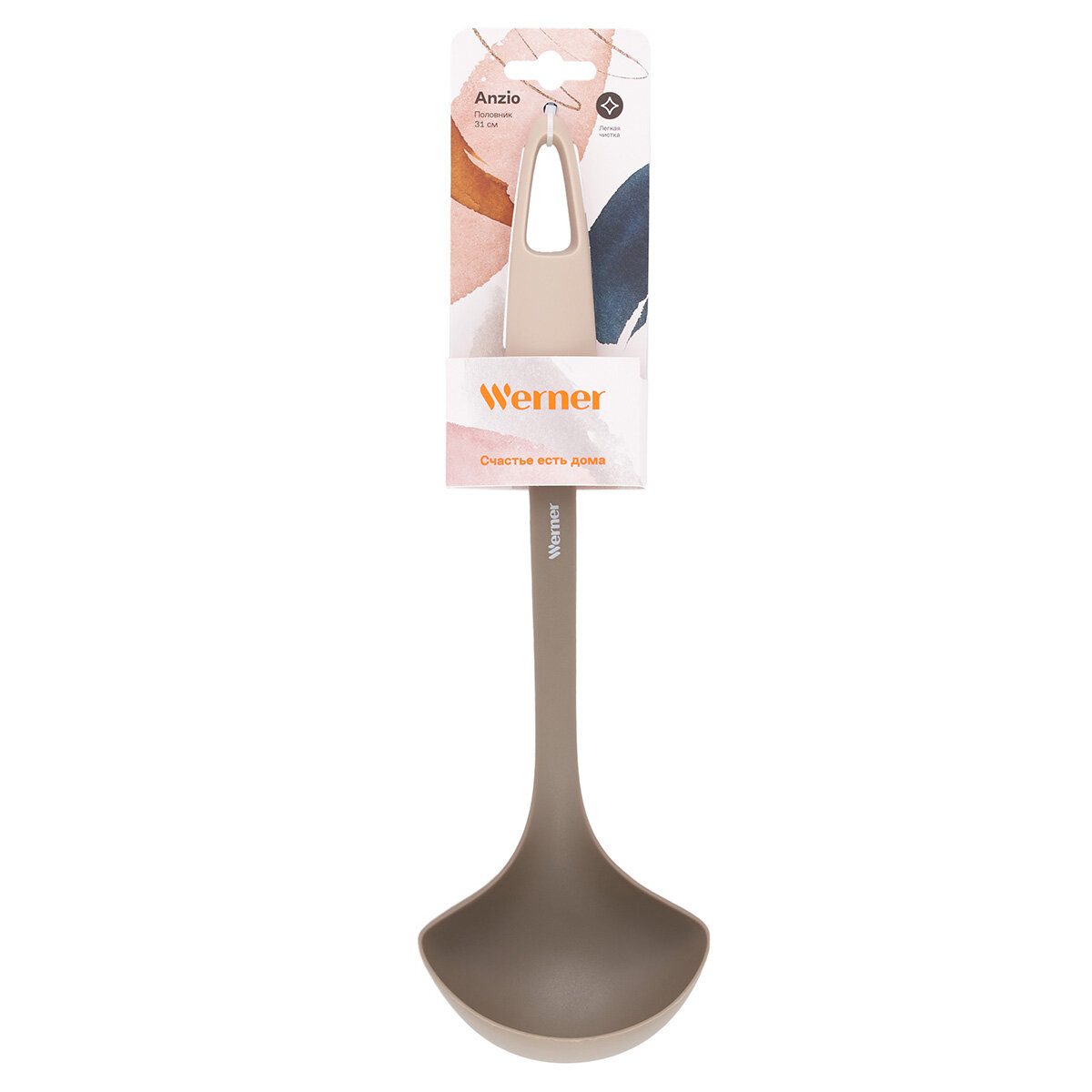 Половник WERNER ANZIO 50004 длиной 31см. Материал рабочей части: нейлон, материал ручки: пластик. Ручка имеет петлю для подвешивания. Половник можно использовать с кастрюлями, имеющими антипригарное покрытие.