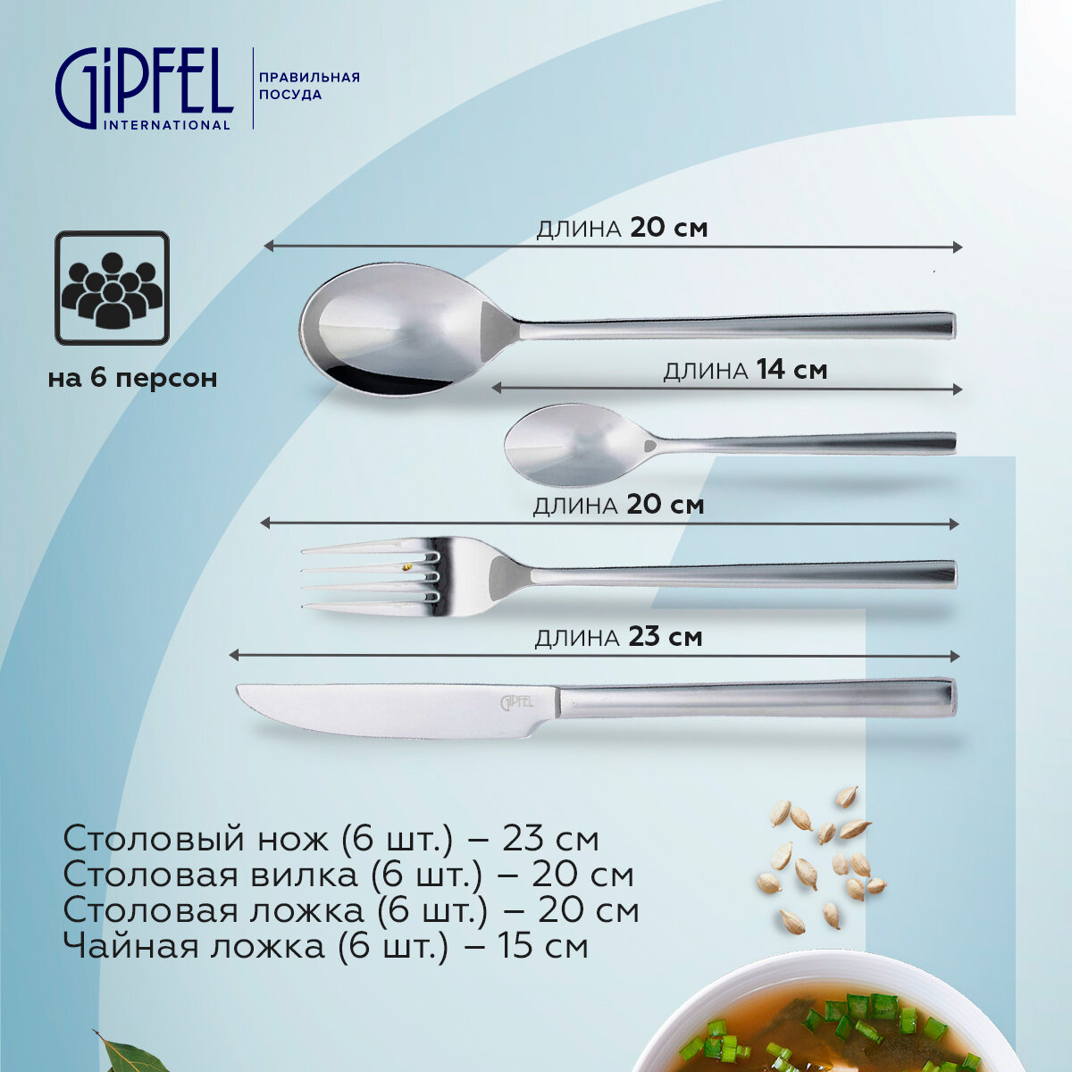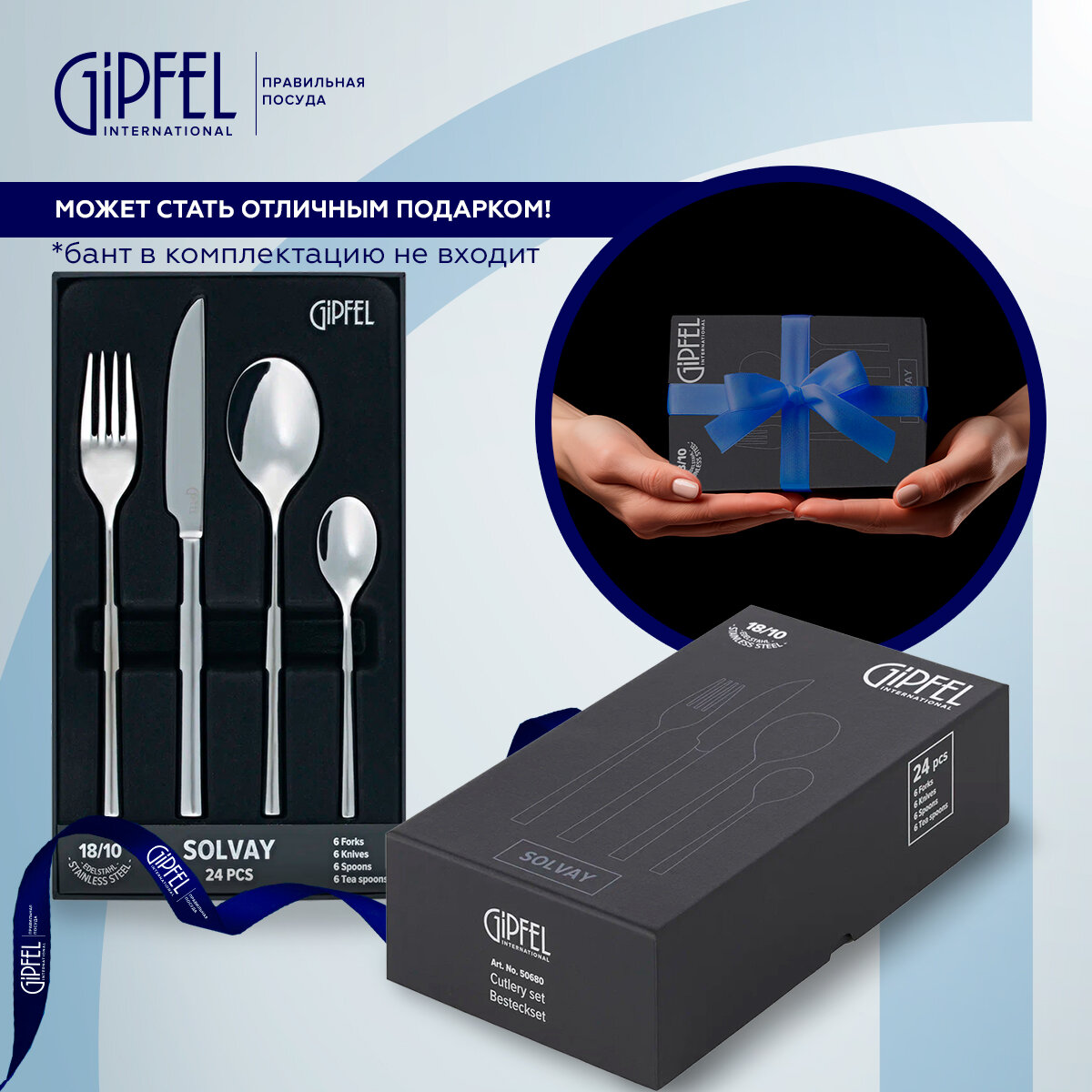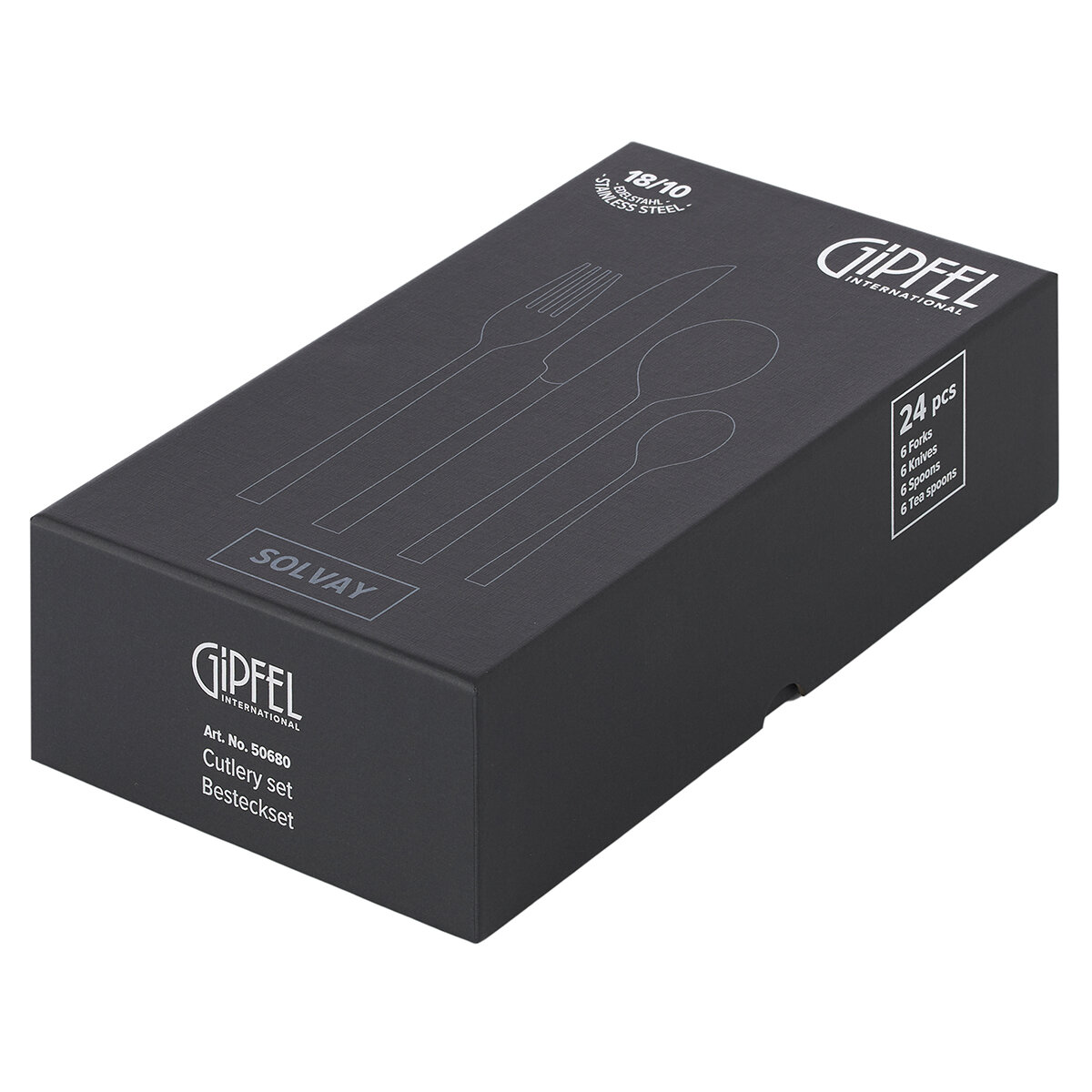 Набор столовых приборов GIPFEL SOLVAY 50680. В наборе 24 предмета на 6 персон. В состав входят 6 столовых ложек, 6 чайных, 6 вилок и 6 столовых ножей. Предметы изготовлены из нержавеющей стали 18/10 и имеют зеркальную полировку. Упакованы в подарочную черную коробку.