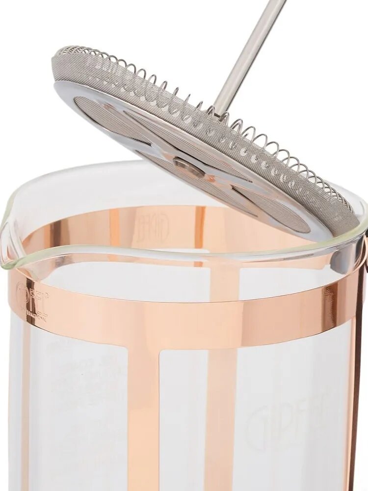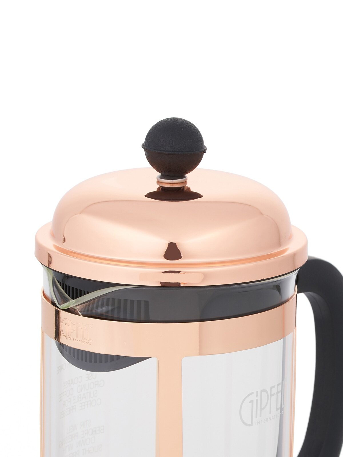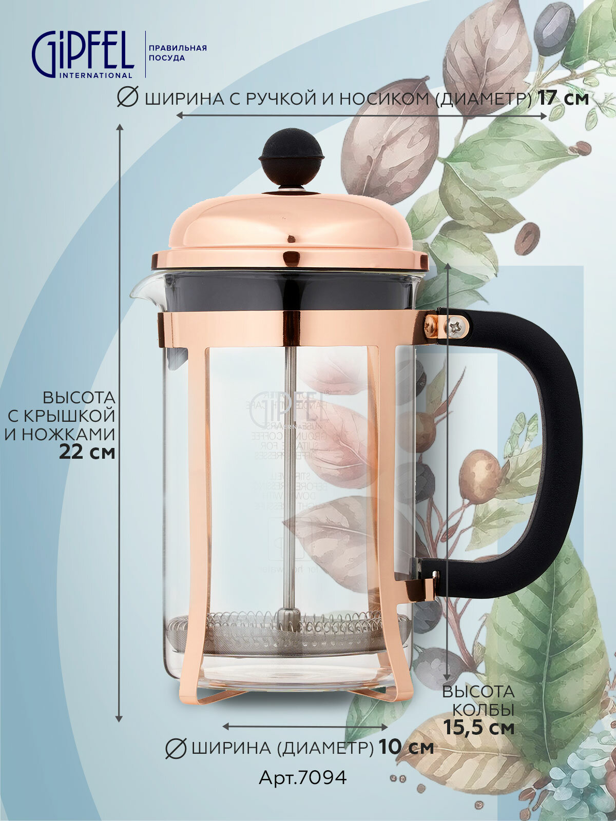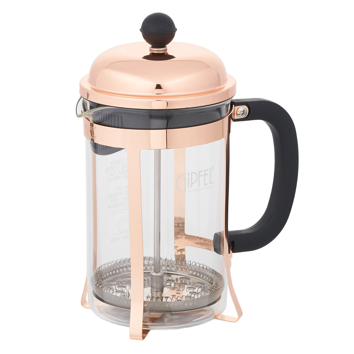 Простой в обращении чайник прозрачный заварочный из серии Claris хорошо впишется в интерьер любой кухни. Объем колбы из жаропрочного стекла составляет 0,8л. Подставка и крышка с покрытием «розовое золото», а кнопка и ручка — из черного пластика. Конструкция модели продумана до мелочей, поэтому использовать такую посуду можно без риска получить ожог. Благодаря системе френч-пресс приготовить ароматный чай и восхитительный кофе не составит труда. Использованная заварка или гуща легко вынимаются. Чайник рекомендуется мыть вручную.