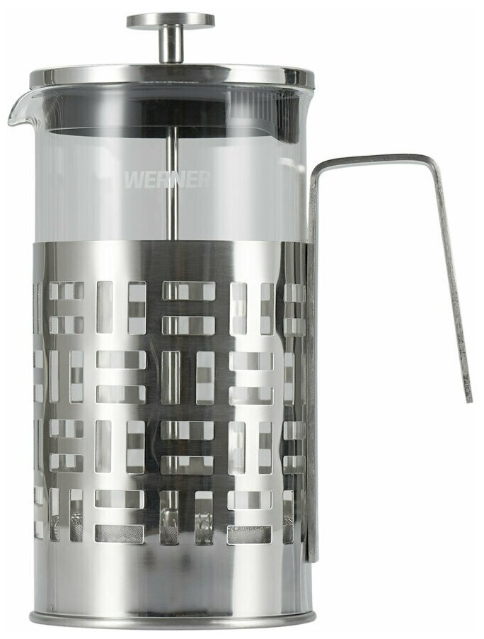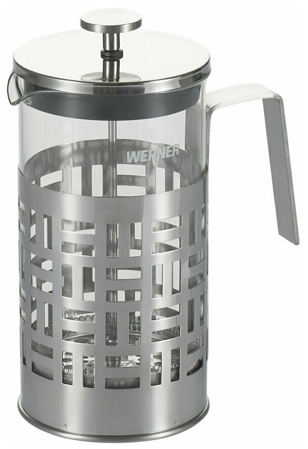 Френч-пресс Werner Cona 50287 1000 мл. Френч-пресс имеет элегантную оправу из резной нержавеющей стали. Оправа защищает колбу от ударов и не дает вам обжечься о горячую поверхность. Для приготовления напитка насыпьте в колбу молотый кофе, залейте горячей водой, опустите пресс-фильтр и оставьте настаиваться. Молотый кофе пресс-фильтр плотно прижмет к дну кофейника, а уплотнительное кольцо не даст ему попасть в напиток. Пресс-фильтр изготовлен из прочной нержавеющей стали и прослужит долго даже при многократном использовании. Колба френч-пресса сделана из жаропрочного боросиликатного стекла. Такая колба не лопнет, если в нее налить кипяток или поставить на холодную поверхность; она устойчива к царапинам и не мутнеет со временем. Благодаря разборной конструкции, ухаживать за френч-прессом легко и удобно. Также френч-пресс можно использовать как чайник для заваривания чая. Высота френч-пресса 22 см. Диаметр колбы 10 см.