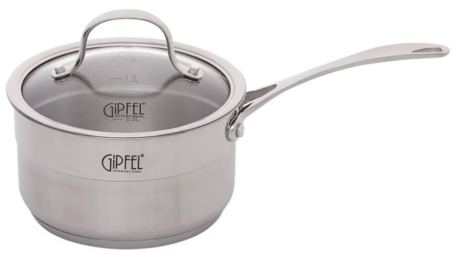 Набор посуды Gipfel GALA 1539 из ковша и 4 кастрюль. К каждому изделию прилагается стеклянная крышка с отверстием для выпуска пара. Толщина стенок посуды составляет 0,8 мм. Она выполнена из экологически безопасной нержавеющей стали, которая не выделяет вредных веществ и не меняет вкус еды. Материал также имеет высокую степень устойчивости к коррозии и механическим повреждениям, что продлевает срок эксплуатации посуды. Кастрюли и ковш оснащены 5-слойным теплоаккумулирующим дном толщиной 4,5 мм: 4 мм алюминий + 0.5 мм сталь18/0. Такая посуда значительно сокращает время при приготовлении различных блюд. Ее можно использовать в духовке и на любых видах плит.