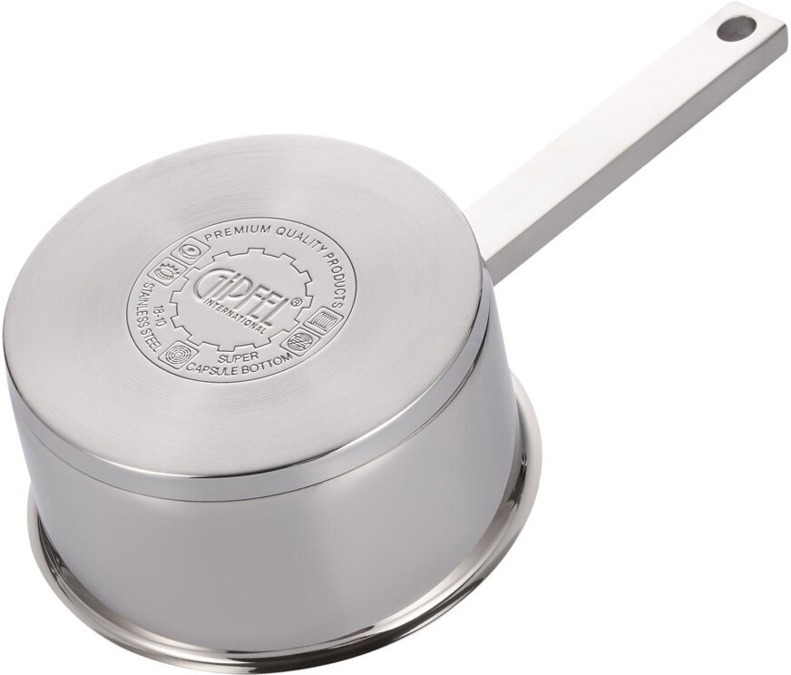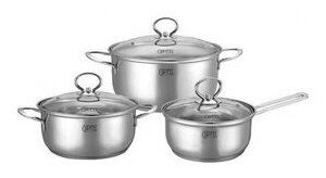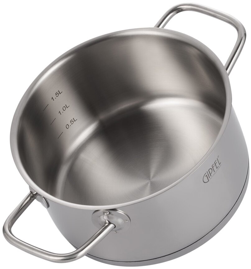 Набор посуды GIPFEL CAPELLA 1512 из 6 пр. В наборе: ковш 16х8/1,6л c крышкой, кастрюля 18х9/2,3л с крышкой, кастрюля 20х11/3,4л с крышкой. Все кастрюли в наборе с индукционным капсульным дном. Кастрюли сделаны из нержавеющей стали 18/10. Толщина стенок 0,6мм, толщина дна 3,5 см. Диаметр дна: 15,5 см, 17,5 см, 19,5 см.