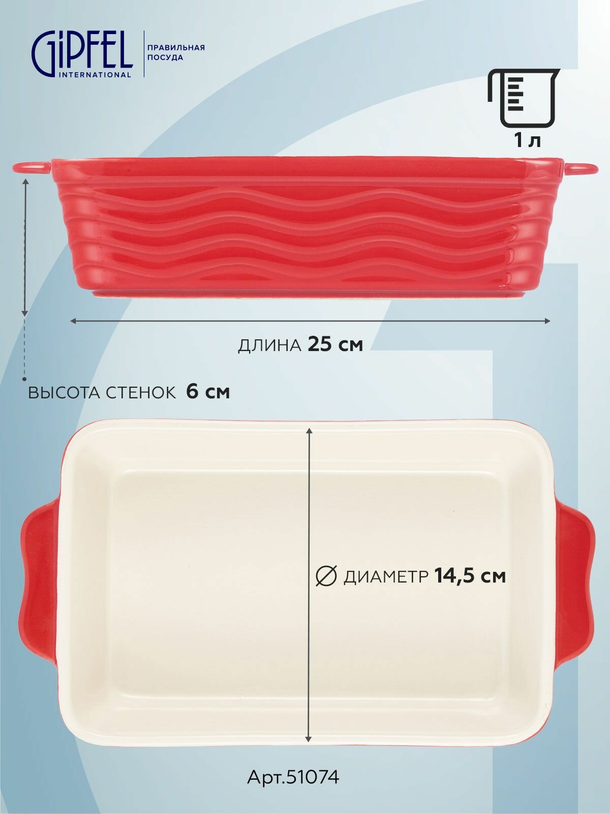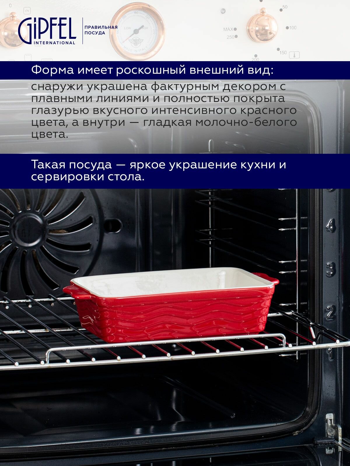 Ориентируйтесь на размеры (20,5×35×7 см), объем (2,1 л) и материал. Керамика Gipfel Rosso подходит для запекания курицы, рыбы, пирогов, выдерживает высокие температуры и легко очищается.