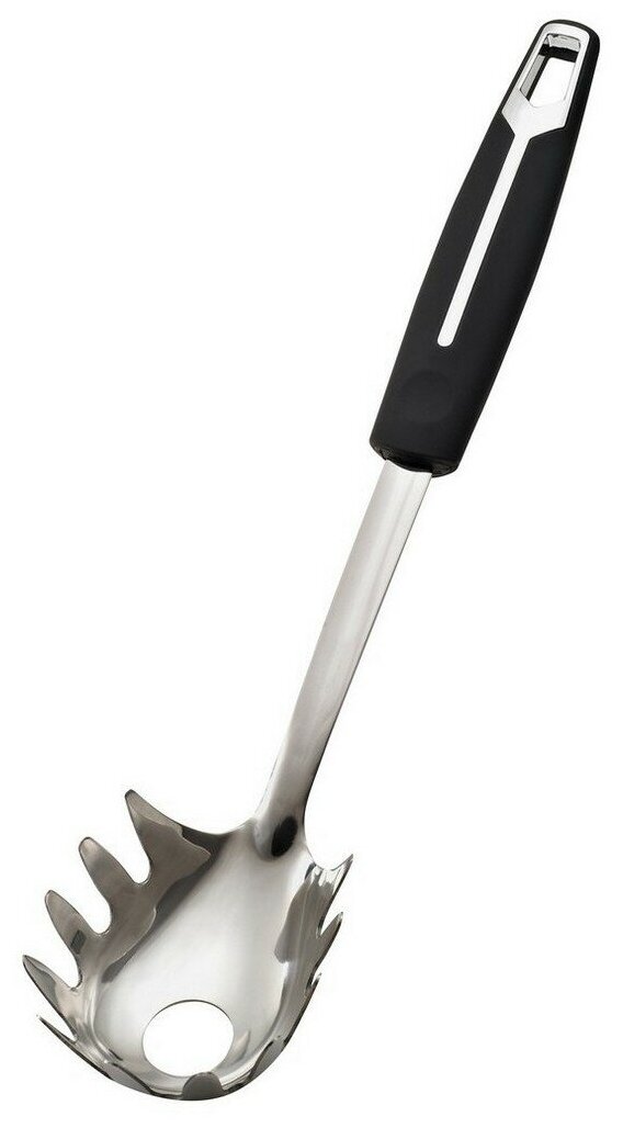 Ложка для спагетти GIPFEL COMET 2061. Ложка выполнена из нержавеющей стали 18/0 с пластиковой ручкой черного цвета. На ручке отверстие для подвешивания. Подойдет для использования с посудой из нержавеющей стали. Размер 31,3х7см.