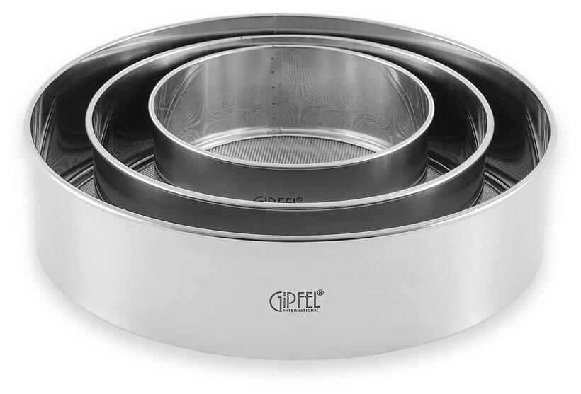 Набор сит для GIPFEL 5734. В наборе 3 сита диаметром 15,5см, 22см, 28см. Сита сделаны из нержавеющей стали, гипоаллергенного и стойкого к коррозии материала. Сита просто незаменимы для любителей выпечки, ведь для приготовления теста всегда рекомендуется использовать просеянную муку, разрыхлитель или крахмал. Маленькое сито можно использовать для просеивания какао или сахарной пудры для посыпки сладких изделий.