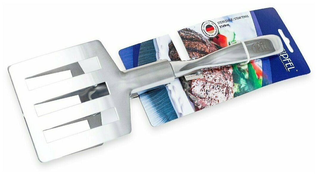 Щипцы для стейков GIPFEL 5724. Щипцы длиной 31см и шириной 9см. Щипцами удобно переворачивать даже большие стейки за счет большой площади их рабочей поверхности. Щипцы сделаны из стойкой к коррозии нержавеющей стали.