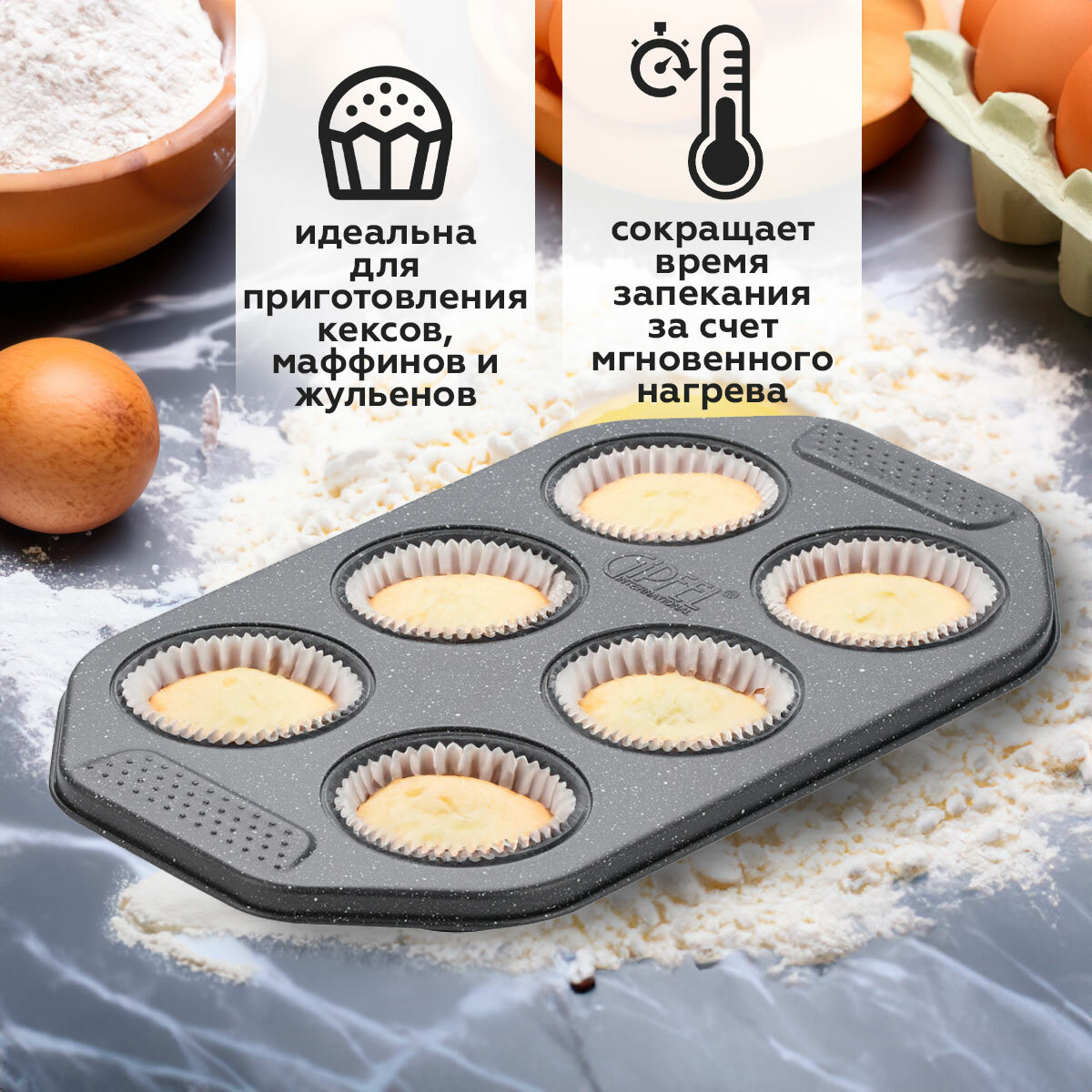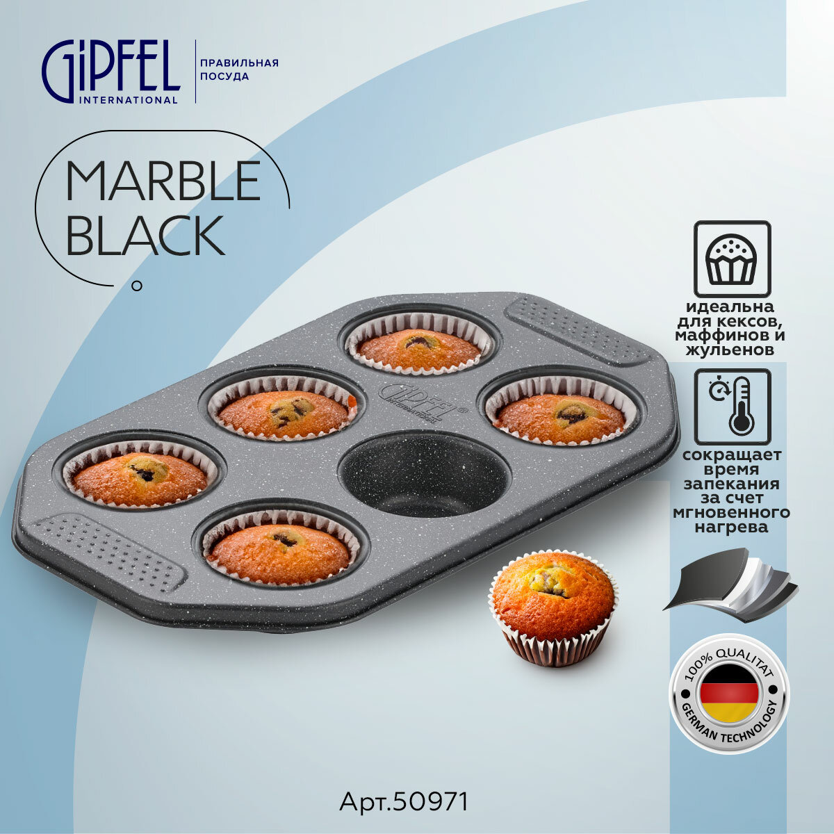 Форма для выпечки GIPFEL MARBLE BLACK 50971. Форма подходит для выпечки 6 кексов 6,5Х3см. Форма с антипригарным покрытием. Материал: углеродистая сталь.