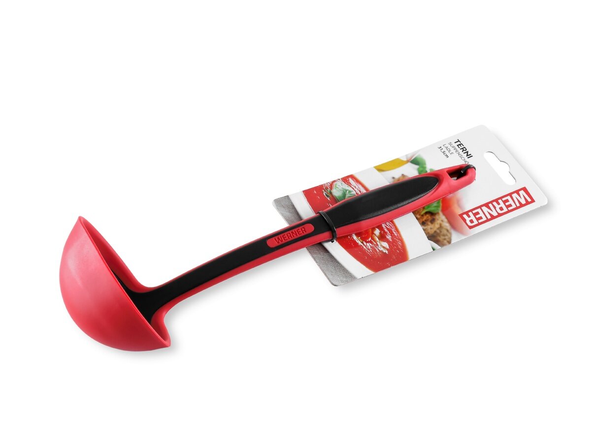 Половник Werner Terni 50158. Размер 31,5 см. Прекрасно подойдет для посуды с антипригарным покрытием. Сделан из пищевого силикона и нейлона красного и черного цветов.