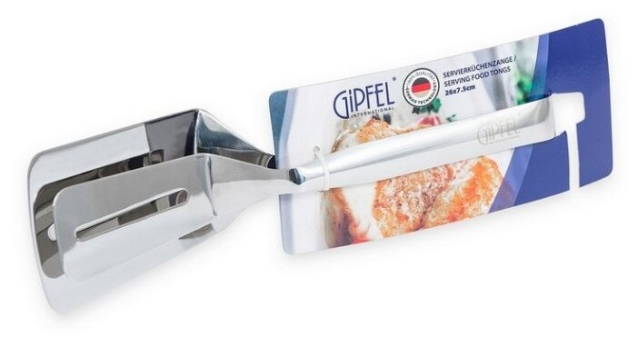 Щипцы сервировочные для подачи блюд GIPFEL 9994. Щипцами удобно подавать мясные стейки, жареную рыбу, бутерброды – за счет увеличенной площади их нижней части пища держится крепко. Длина щипцов 26см, ширина 7,5см. Щипцы сделаны из стойкой к коррозии нержавеющей стали.
