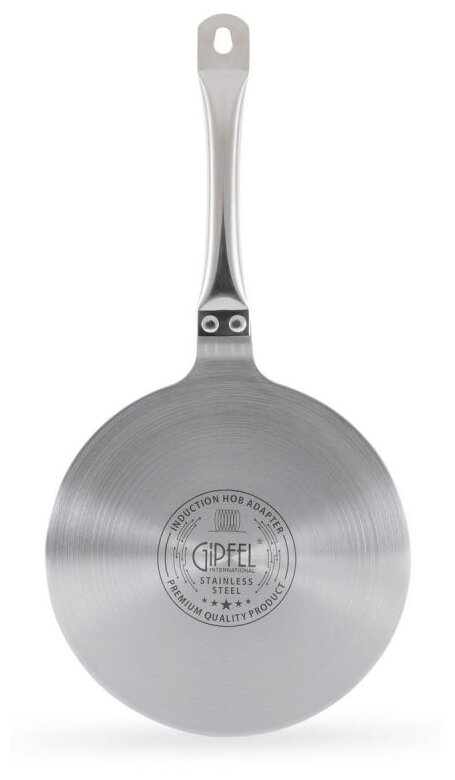 Адаптер для индукционных плит GIPFEL 6415. Адаптер представляет собой диск толщиной 3,4 мм, состоящий из слоев алюминия и ферромагнитной стали. Диаметр диска 20 см. Длина с ручкой 40см. Обратите внимание, что дно используемой на нем посуды должно покрывать не менее 80% площади адаптера. У адаптера удобная не нагревающаяся ручка, с помощью которой можно снять его с варочной панели или перенести на другую конфорку. Устанавливайте адаптер и посуду на него сразу после включения плиты. Не оставляйте пустой адаптер на включенной плите. Очищать его рекомендуется вручную неабразивными средствами.