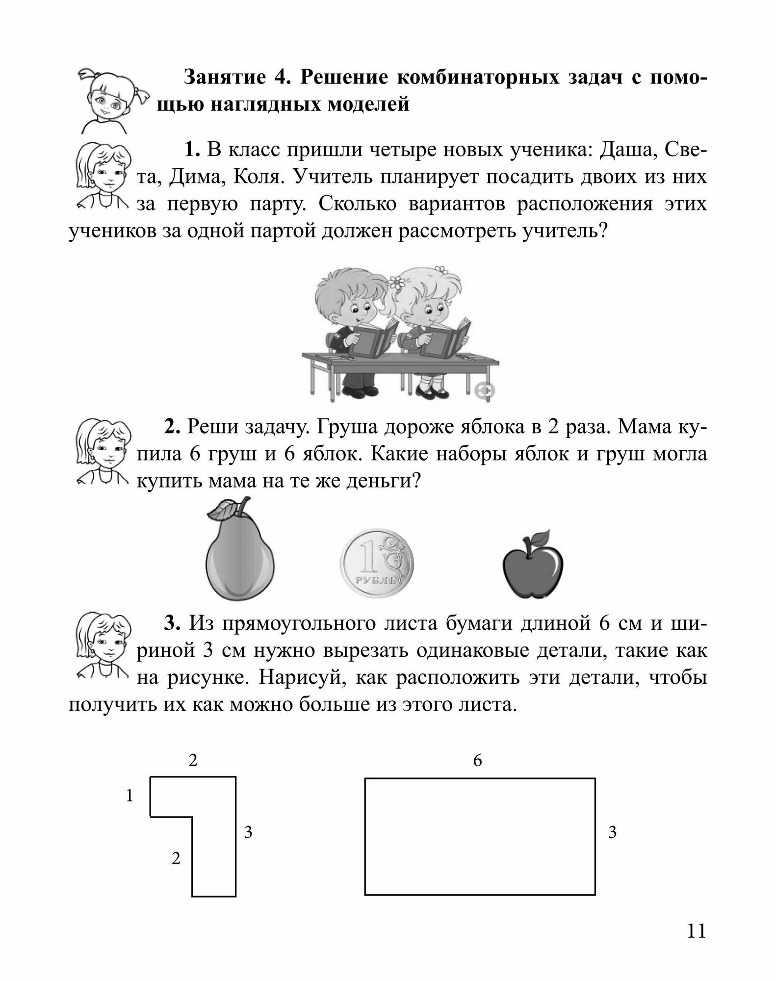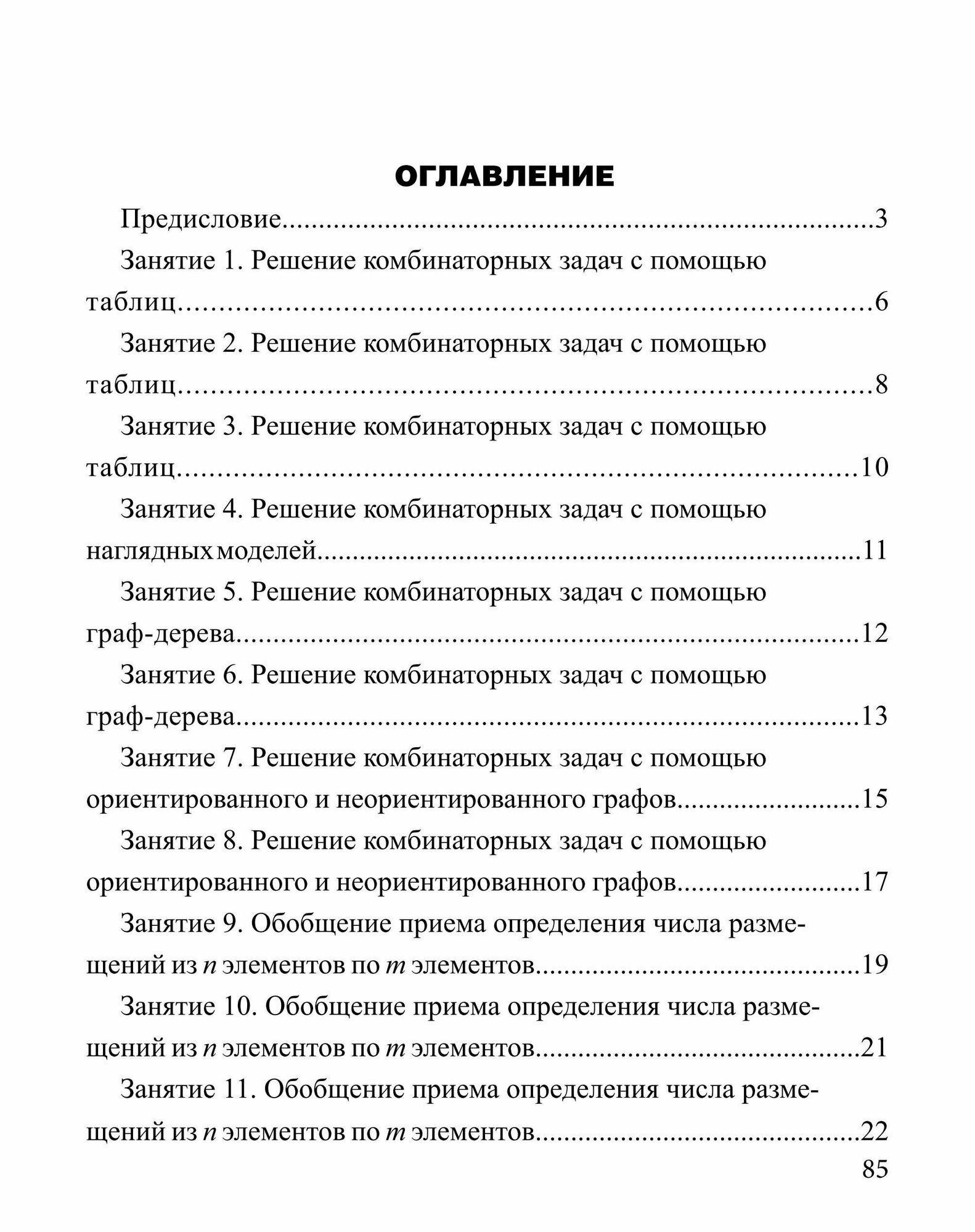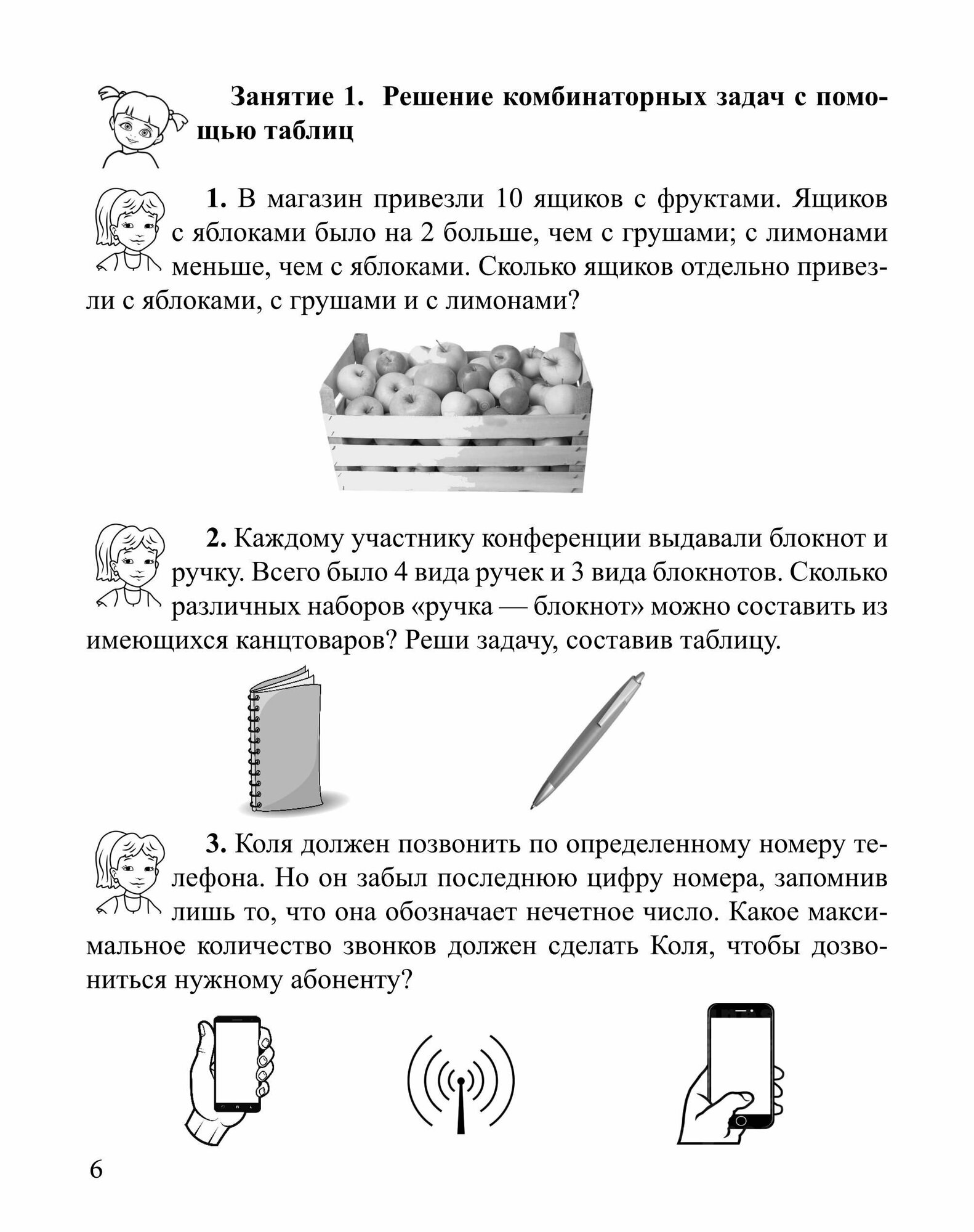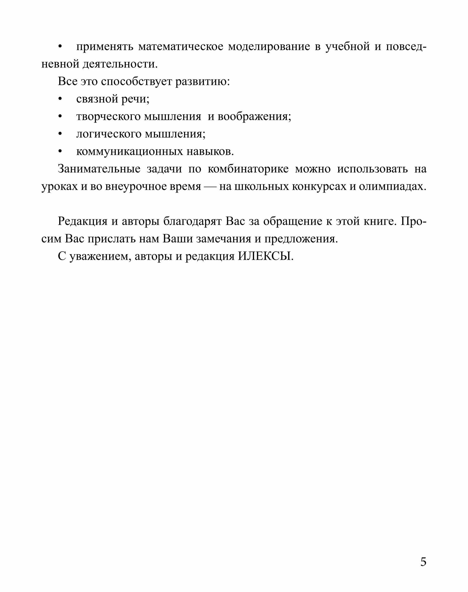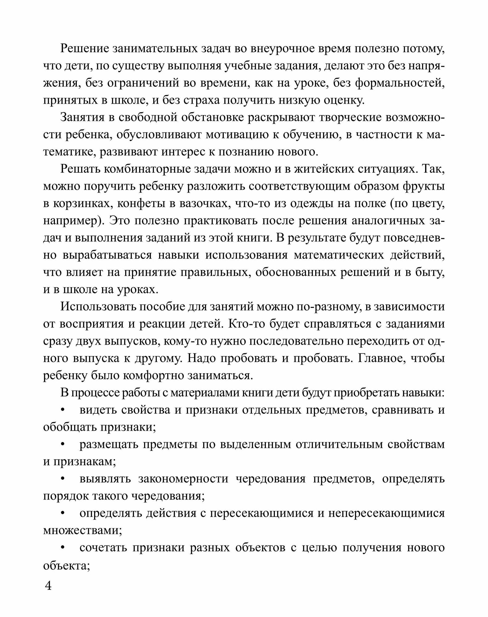 В этой книге представлены задачи по комбинаторике, способствующие интеллектуальному развитию детей и формированию у них мыслительных навыков, связанных с выбором результативных решений, способов, действий, комбинаций вариантов в реальных жизненных условиях. Мы постоянно сталкиваемся с той или иной проблемой, и тут важно перебрать все варианты выхода из сложной ситуации, найти оптимальное решение проблемы и оценить возможные риски. Справиться с этим сможет тот, кто с раннего возраста занимается комбинаторикой и приобщен к решению комбинаторных задач.
