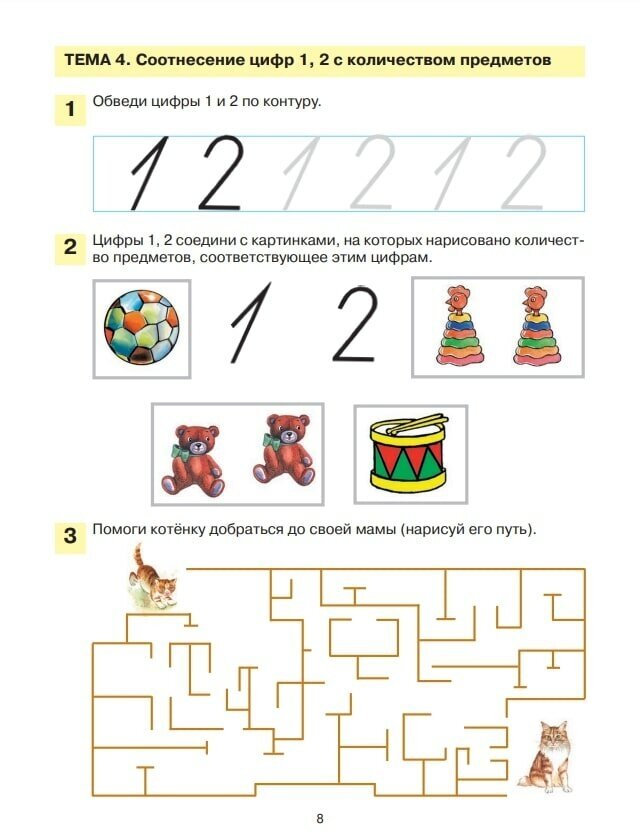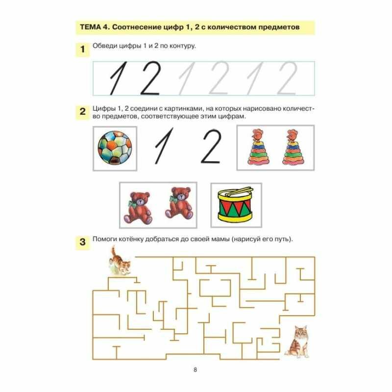 с которыми будет способствовать формированию навыков счёта в пределах 5, умения изобразить цифры от 1 до 5 и соотносить их с количеством предметов. Ребята будут ориентироваться в пространстве, раскрашивать и обводить предметы, исправлять ошибки.