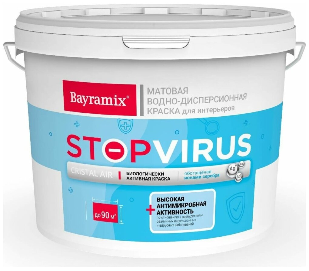 Краска Bayramix Cristal Air Stopvirus база А предназначена для внутренней окраски стен и потолков в жилых и общественных помещениях, а также в дошкольных и лечебно-оздоровительных организациях с нормальной эксплуатационной нагрузкой. Подходит для нанесения практически на любые предварительно подготовленные минеральные основания, ДСП, ДВП, а также на все типы обоев под покраску.