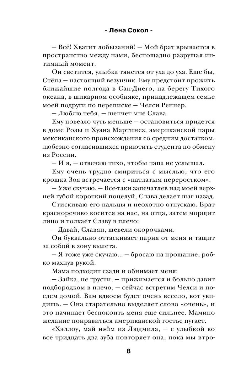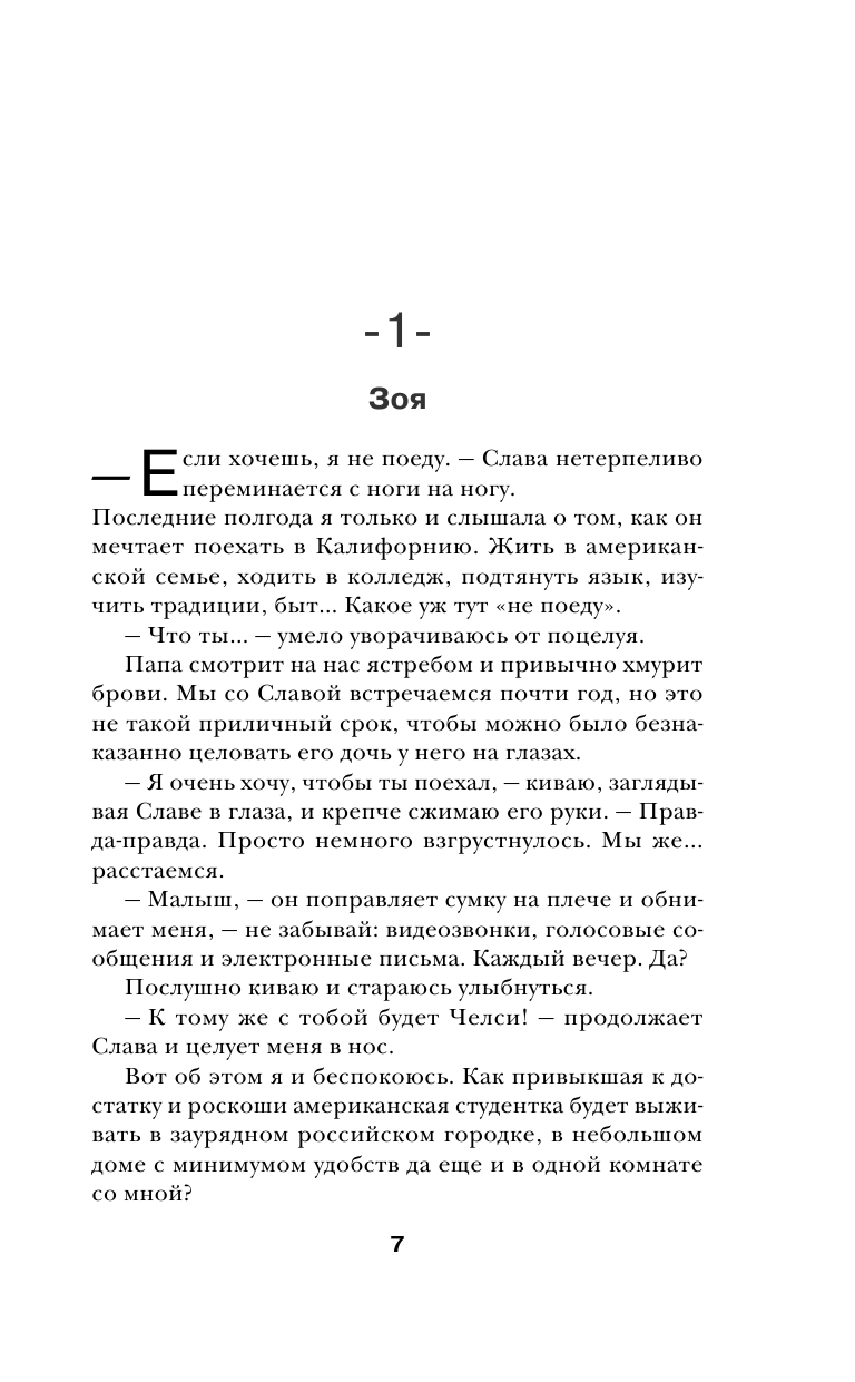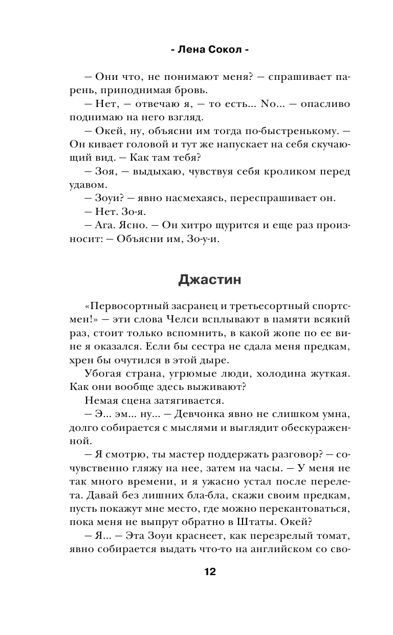Сюжет: история о русской девушки Зое и американце Джастине. Любимая парочка, встреча которых изменила их жизнь навсегда, не смотря на языковой барьер и разные страны. В книге столько юмора, чего стоит первое застолье Джастина с родителями Зои. Ох, уж эта "о, крошка", борЩ, рашн салат и желе из мяса... А рыбалка с отцом Зои.