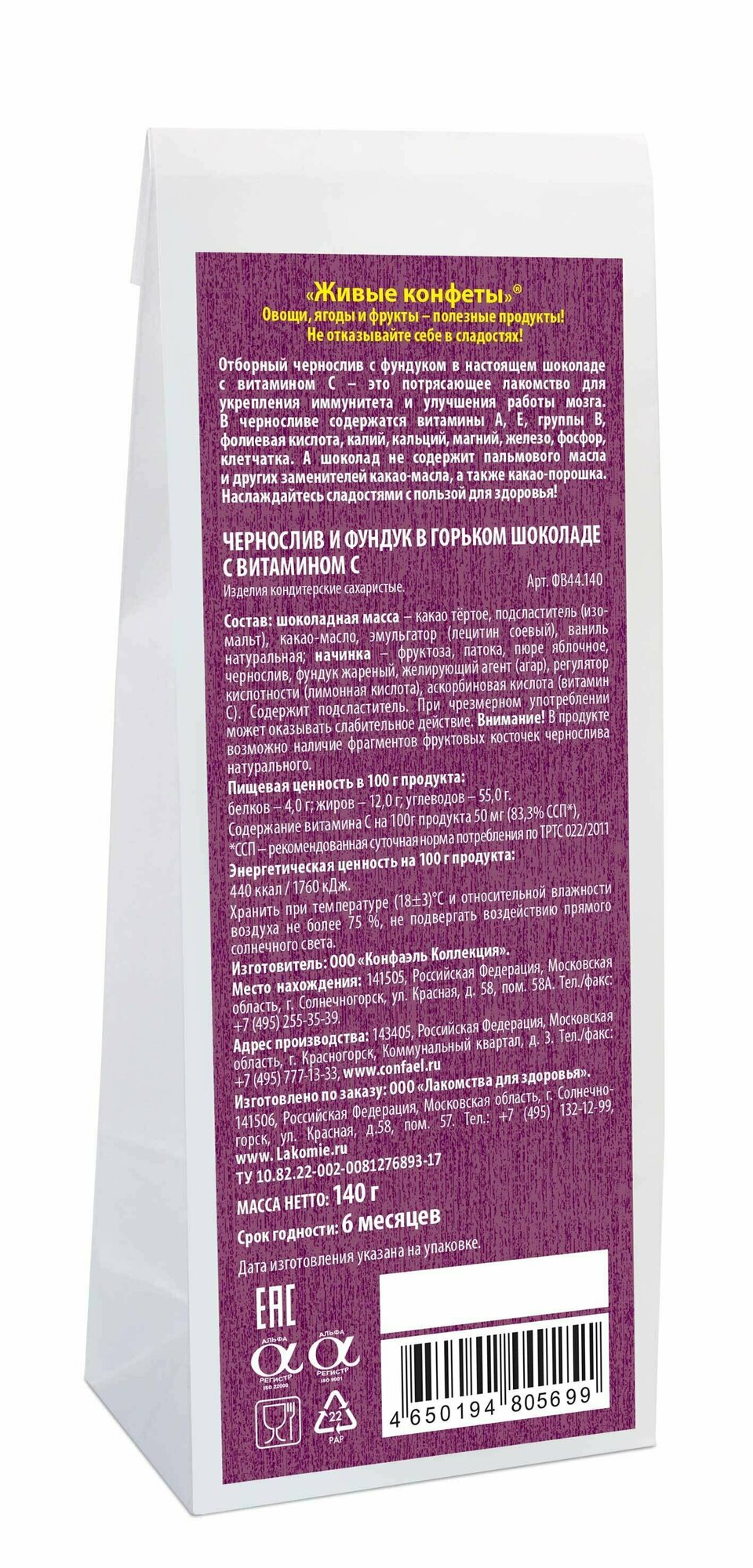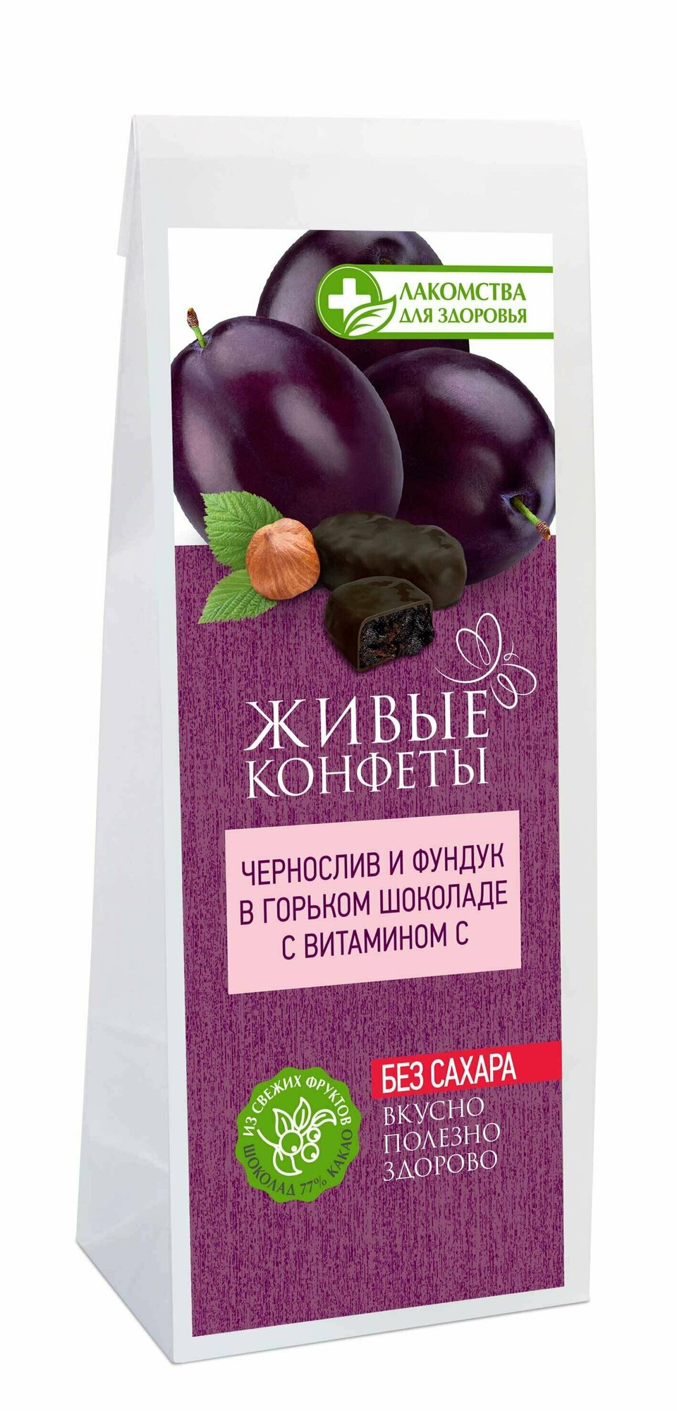 Конфеты Живые конфеты Чернослив и фундук в горьком шоколаде с витамином С 120г