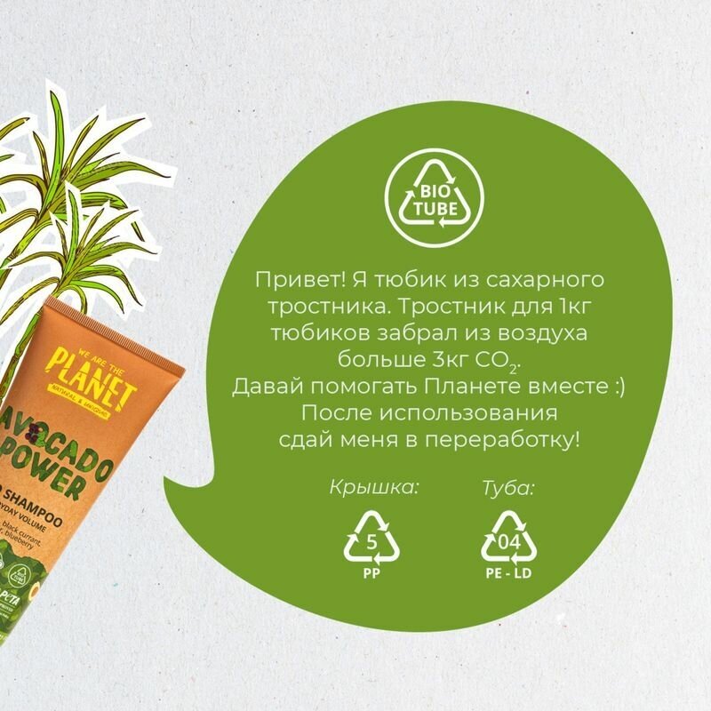 Бальзам для объема и силы волос WE ARE THE PLANET Avocado Power, 200 млБио бальзам для волос с маслом макадамии, экстрактами авокадо, винограда, черной смородины, мяты, ромашки и голубики дарит волосам мягкость, шелковистость, естественный блеск, объем и силу. Содержит компоненты, сертифицированные по международному стандарту натуральной и органической косметики. Не содержит: SLS, SLES, силиконов, парабенов, PEG/PPG, ГМО, минеральных масел, продуктов нефтехимии, глютена, компонентов животного происхождения, микропластика и синтетических красителей. Туба 100% перерабатываемая и более чем на 97% состоит из сахарного тростника. Способ применения: Нанесите бальзам на чистые влажные волосы, легкими массажными движениями распределите по всей длине. Дайте активным компонентам несколько минут (3-5), затем тщательно промойте каждую прядь теплой водой.