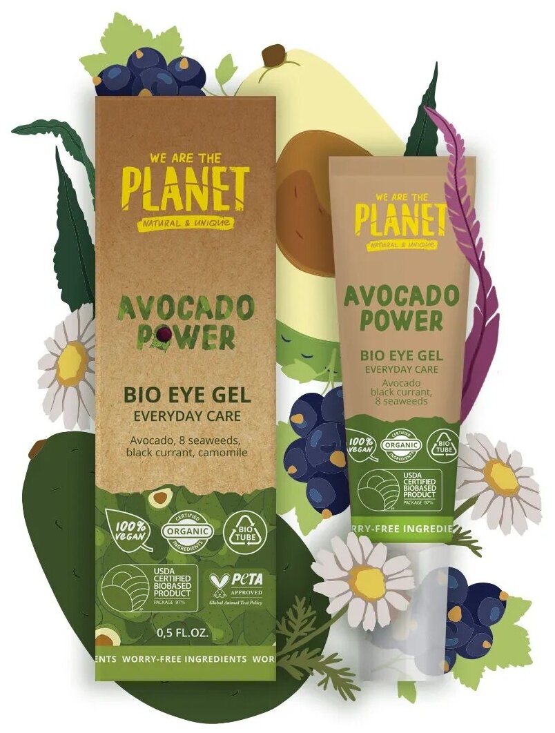 Гель для век и области вокруг глаз We are the planet Avocado Power устраняет темные круги и отечность, освежает и придает естественное сияние. Улучшает тонус и эластичность, помогает уменьшить видимость морщин. Экстракты авокадо, голубики, черной смородины, ромашки и водорослей в составе — интенсивно увлажняют и питают, насыщают витаминами и защищают от воздействий внешних факторов. Легко наносится и быстро впитывается. Не оставляет липкой пленки и жирного блеска.