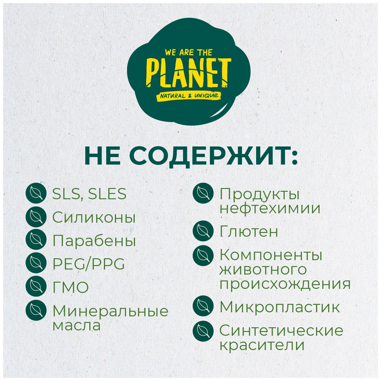 | Особенности | Не содержит SLS, SLES, парабенов, компонентов животного происхождения, микропластика, минеральных масел, фталатов, продуктов нефтехимии, глютена, PEG/PPG, GMO и синтетических красителей. |