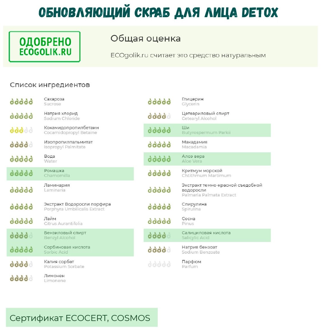 | Химический состав | Sucrose*, Glycerin*, Salt*, Cetearyl Alcohol, Cocamidopropyl Betaine, Butyrospermum Parkii (Shea) Butter**, Isopropyl Palmitate*, Macadamia Ternifolia Seed Oil*, Aqua, Aloe Barbadensis Leaf Extract**, Chamomilla Recutita (Matricaria) Flower Extract**, Crithmum Maritimum Extract*, Himanthalia Elongata Extract*, Laminaria Digitata Extract*, Laminaria Saccharinata Extract*, Lithothamnium Calcareum Extract*, Palmaria Palmata Extract*, Porphyra Umbilicalis Extract*, Spirulina Maxima Extract*, Citrus Aurantifolia (Lime) Fruit Extract*, Pinus Sibirica (Cedar) Shell Powder*, Benzyl Alcohol**, Salicylic Acid**, Sorbic Acid**, Sodium Benzoate*, Potassium Sorbate*, Parfum, Limonene. *натуральное происхождение; **сертифицировано по международному стандарту натуральной и органической косметики |
