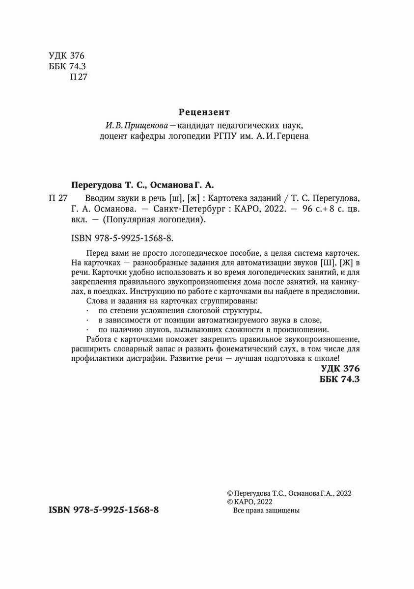 Вводим звуки Ш Ж в речь. Картотека заданий (Перегудова Татьяна Сергеевна, Османова Гурия Абдулбарисовна); Каро, 2022