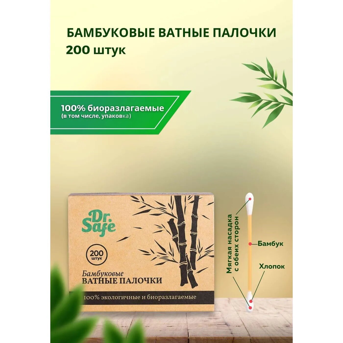 Этот неизменный для каждой косметички и домашней аптечки аксессуар экологичен, безопасен и многофункционален. Палочки можно использовать не только по прямому назначению, но также для нанесения точечного макияжа Удобство и безопасность На концах каждой палочки – две покрытые 100% хлопком подушечки. Несмотря на плотную обмотку, препятствующую отслоению волокон, они мягкие и очень нежные. Бамбуковый стержень тонок и гибок, благодаря чему использование станет для вас ещё более удобным и комфортным. С помощью палочек, кроме известных процедур, можно как точечно нанести косметику, так и удалить её оставшиеся следы. Экологичность Комплект полностью экологичен – от упаковки до самих изделий. Стержни изготовлены из бамбука, подушечки покрыты хлопком. В отличие от широко распространённых пластиковых палочек новые изделия от Dr.Safe не наносят вреда окружающей среде. Упаковка Яркая информативная упаковка биоразлагаема. После использования не требует специальной утилизации – быстро самоуничтожается под естественным воздействием бактерий и грибков. Приобретая ватные бамбуковые палочки от Dr.Safe, вы вносите свой посильный вклад в борьбу за чистоту окружающей среды, помогаете сберечь «лёгкие» планеты и собственное здоровье.