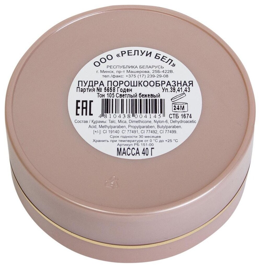 | Полное наименование | Пудра порошкообразная Relouis (тон 105, светлый бежевый) |