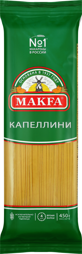 Макароны MAKFA Капеллини, вермишель длинная, подходят для приготовления аппетитных куриных, грибных супов и других блюд, а также превосходно гарниров. Это блюдо можно подавать к колбаскам, сосискам, сарделькам, мясу, рыбе или птице. Макароны удачно сочетаются с тертым сыром и овощными соусами. Продукт изготовлен из муки из твердых сортов пшеницы высочайшего качества.