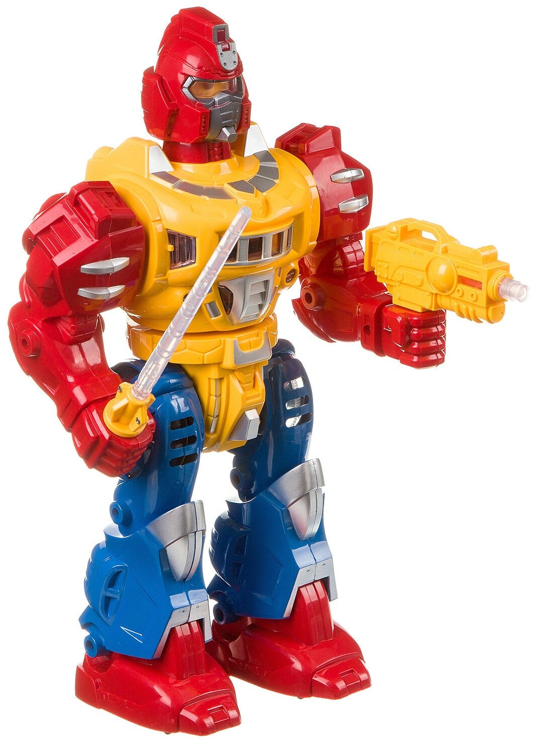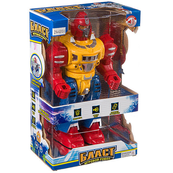 Игровой робот "Бласт" поражает воображение своей реалистичностью и функционалом. Он шагает вперед, двигает головой, руками, ногами, вращается на 360 градусов, произносит фразы (на русском языке), воспроизводит звуки атаки. Косморобот оснащен мощным оружием - мечом с подсветкой и боевым бластером.