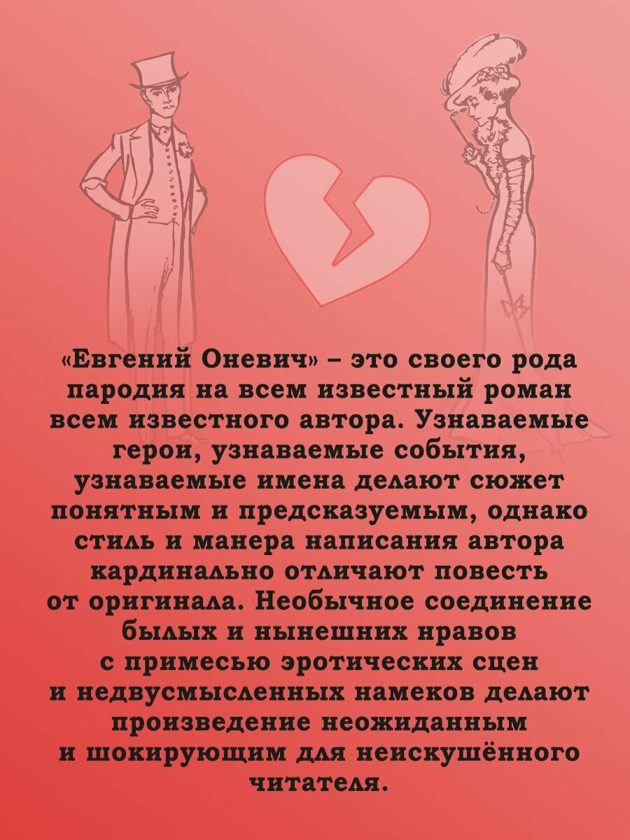 "Евгений Оневич" - это своего рода пародия на всем известный роман всем известного автора. Узнаваемые герои, узнаваемые события, узнаваемые имена делают сюжет понятным и предсказуемым, однако стиль и манера написания автора кардинально отличают повесть от оригинала. Необычное соединение былых и нынешних нравов с примесью эротических сцен и недвусмысленных намеков делают произведение неожиданным и шокирующим для неискушённого читателя.